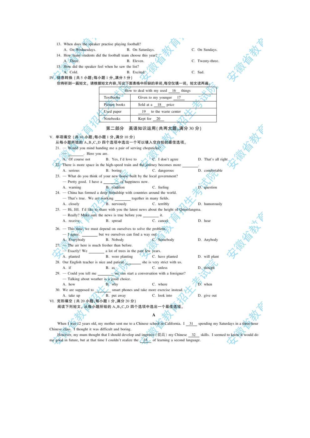 【文档预览】 无忧考网整理发布2020年安徽巢湖中考英语真题及答案(图片版),前五页预览如下: