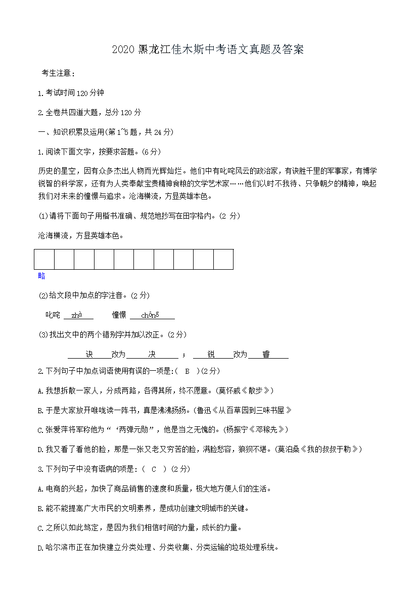 【文档名称】 2020黑龙江佳木斯中考语文真题及答案(Word版).doc