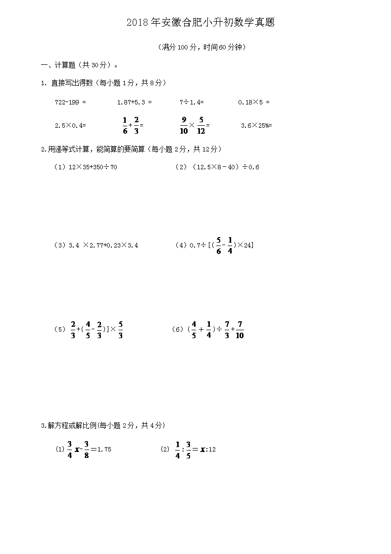 【文档名称】 2018年安徽合肥小升初数学真题(Word版).doc