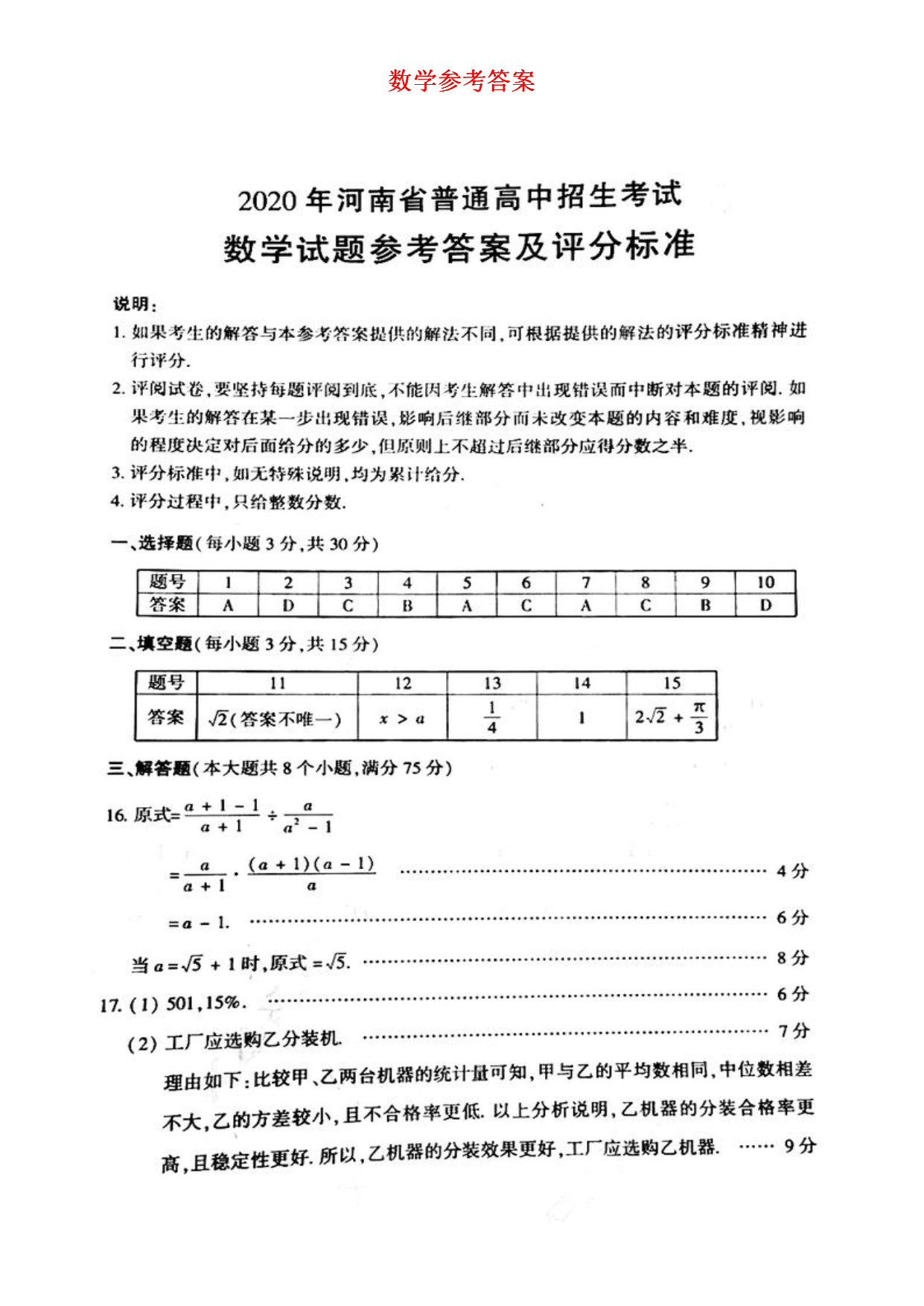 【文档预览】 无忧考网整理发布2020年河南省驻马店中考数学试题及答案(图片版),前五页预览如下: