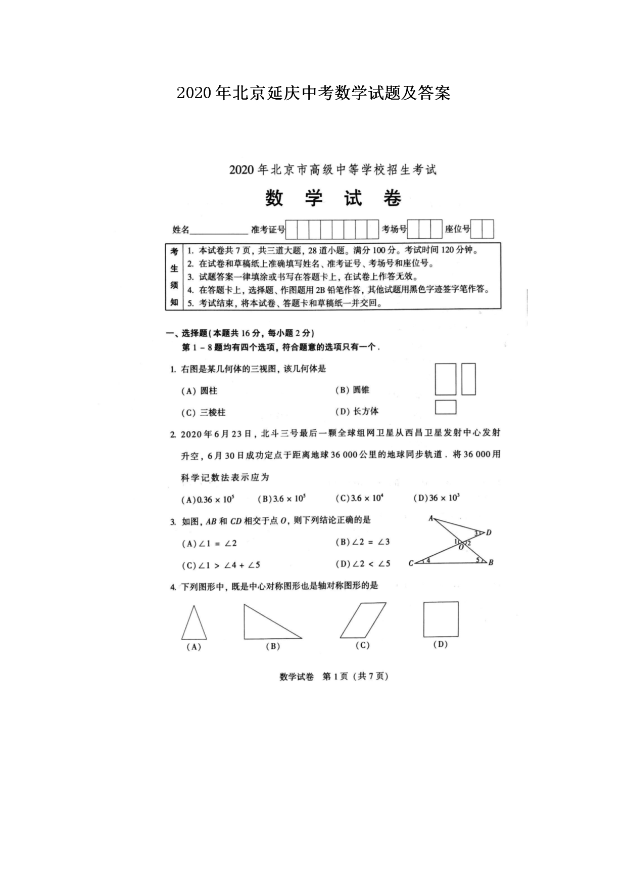 【文档名称】 2020年北京延庆中考数学试题及答案(Word版).doc
