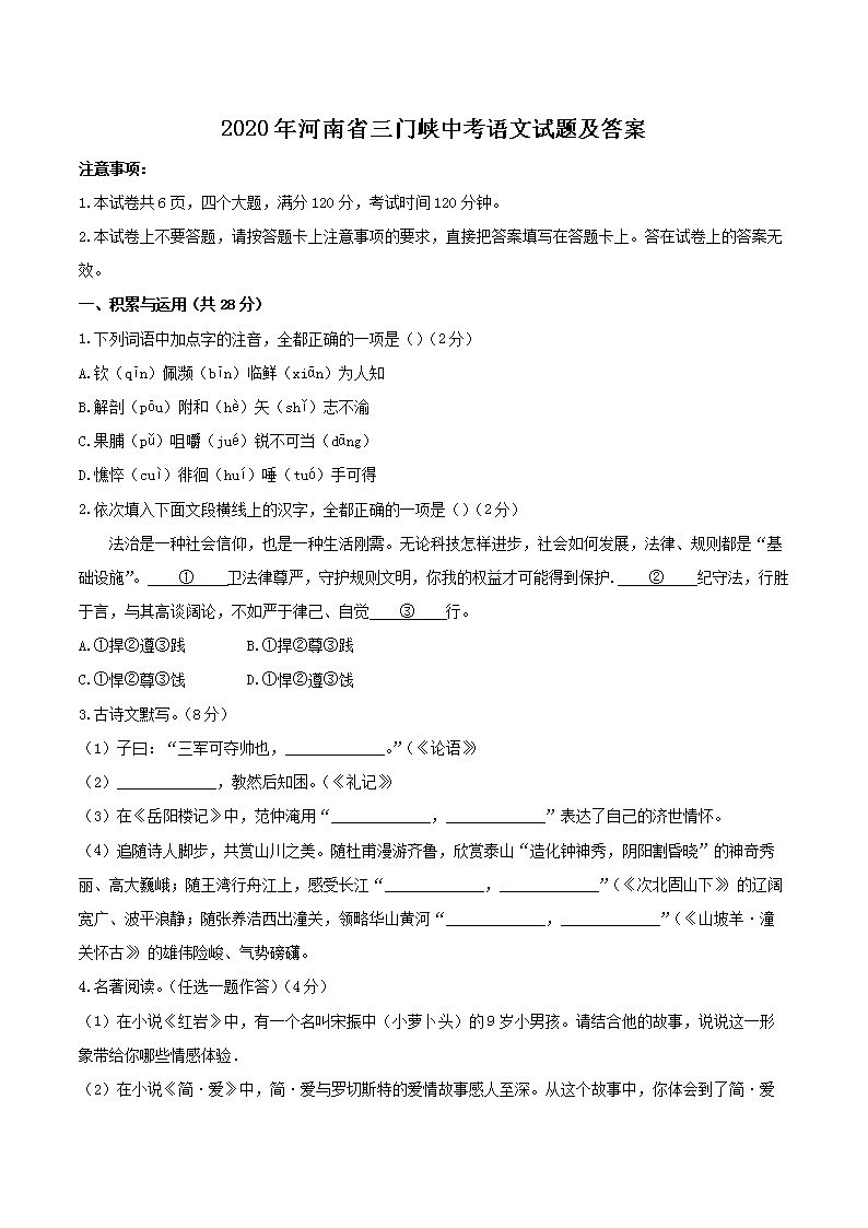 【文档名称】 2020年河南省三门峡中考语文试题及答案(Word版).doc