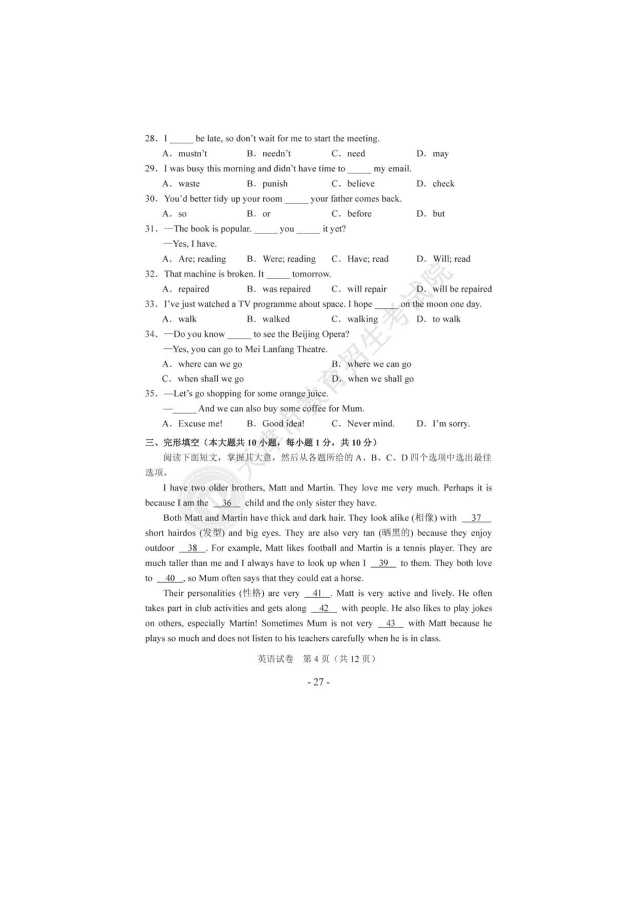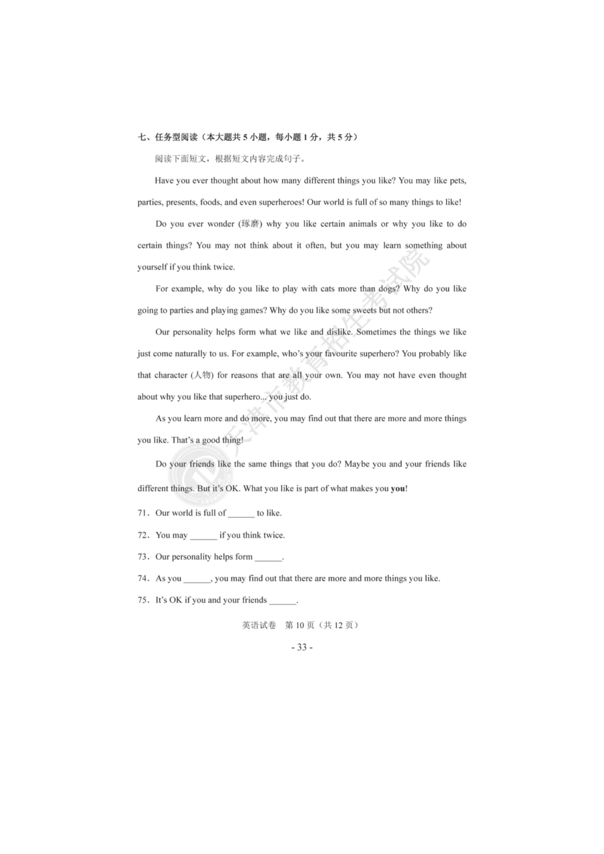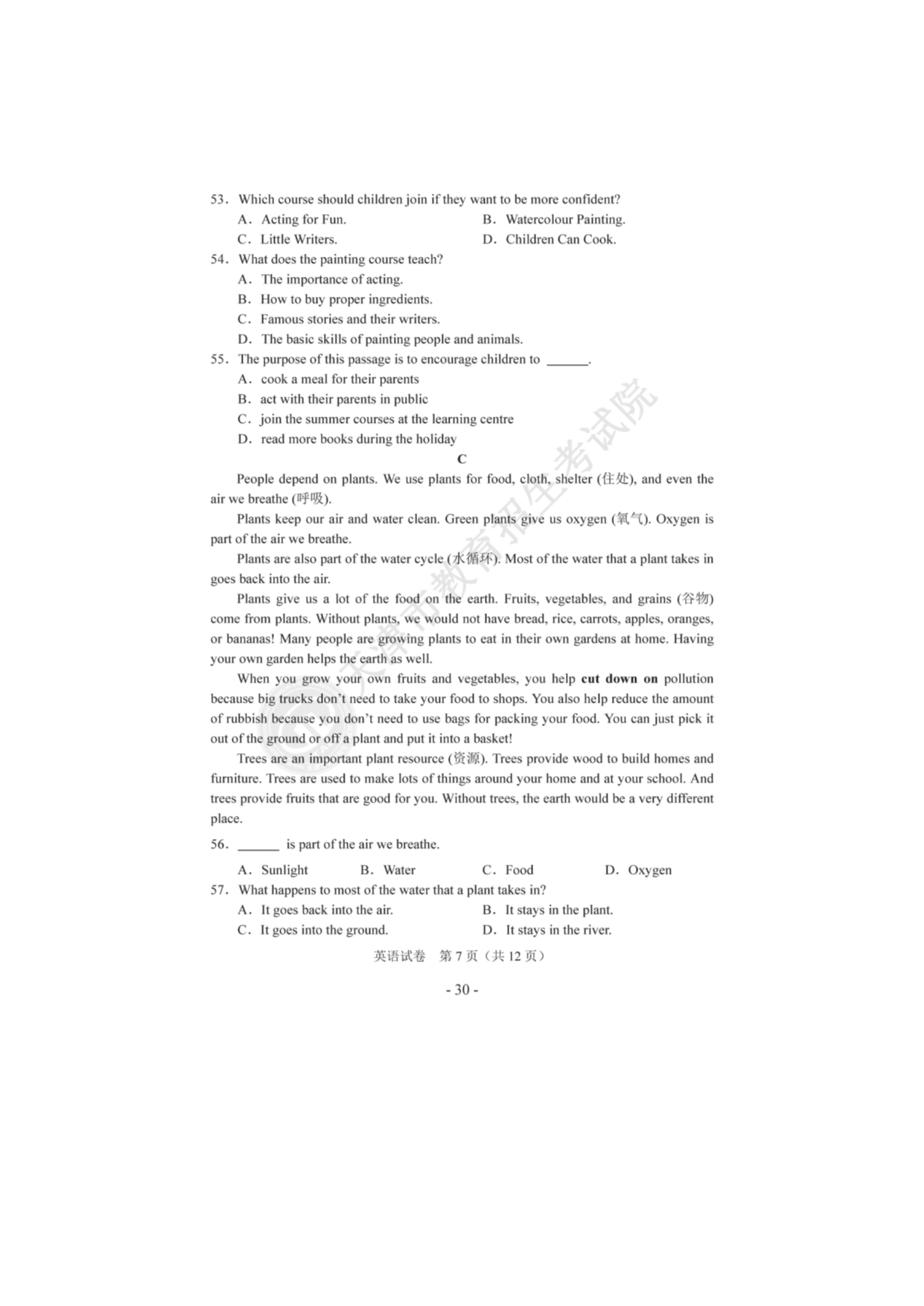 【文档预览】 无忧考网整理发布2020年天津武清中考英语真题及答案(图片版),前五页预览如下: