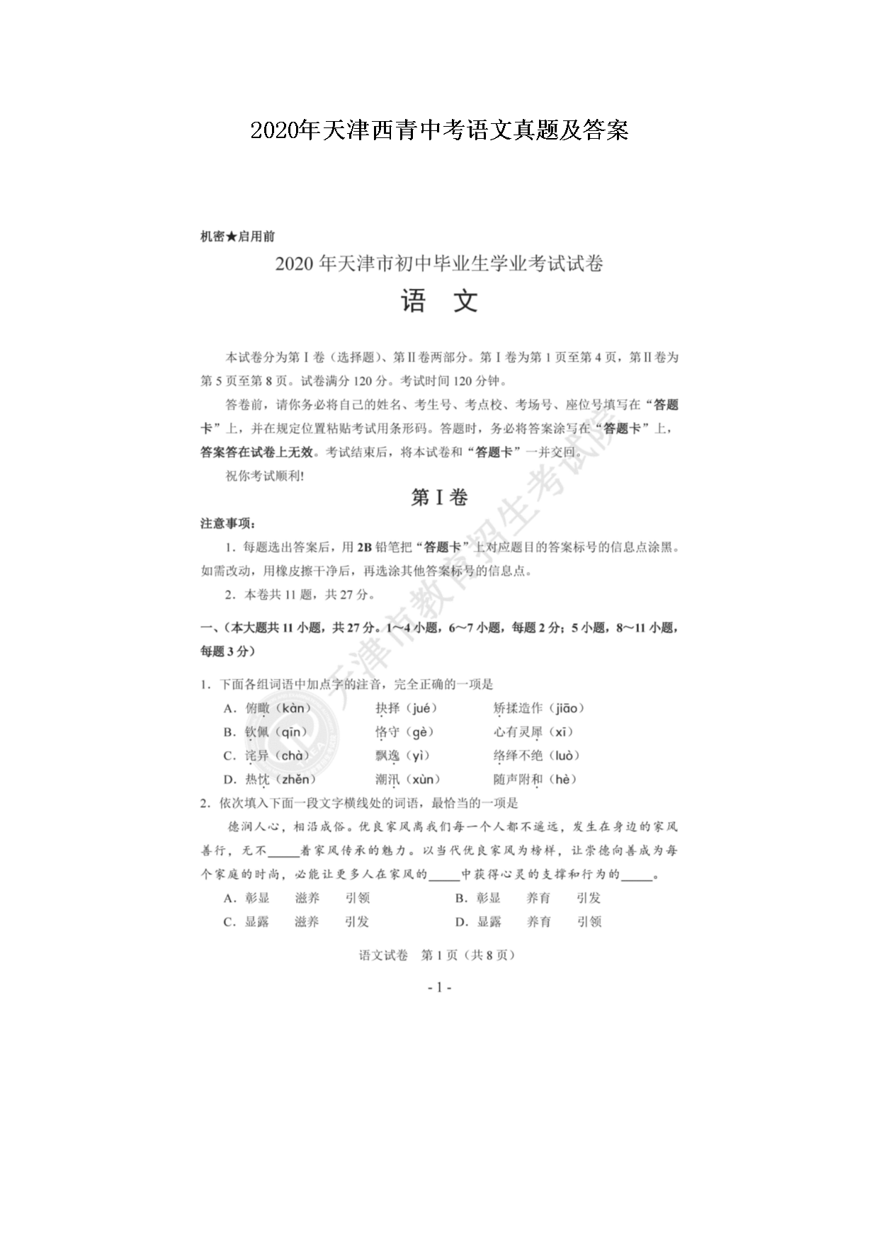 【文档名称】 2020年天津西青中考语文真题及答案(图片版).doc