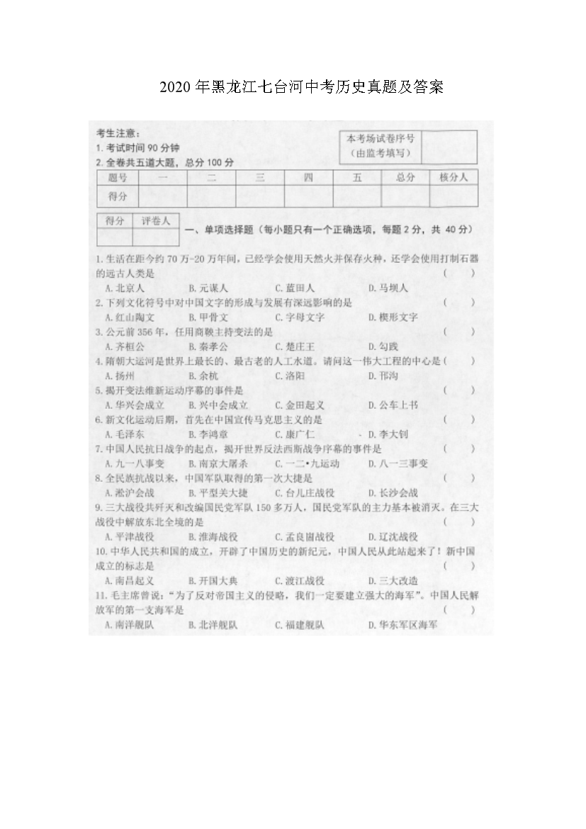 【文档名称】 2020年黑龙江七台河中考历史真题及答案(图片版).doc