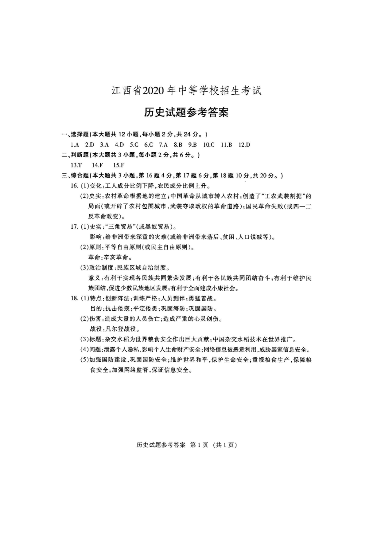 【文档名称】 2020年江西鹰潭中考历史试题及答案(图片版).doc