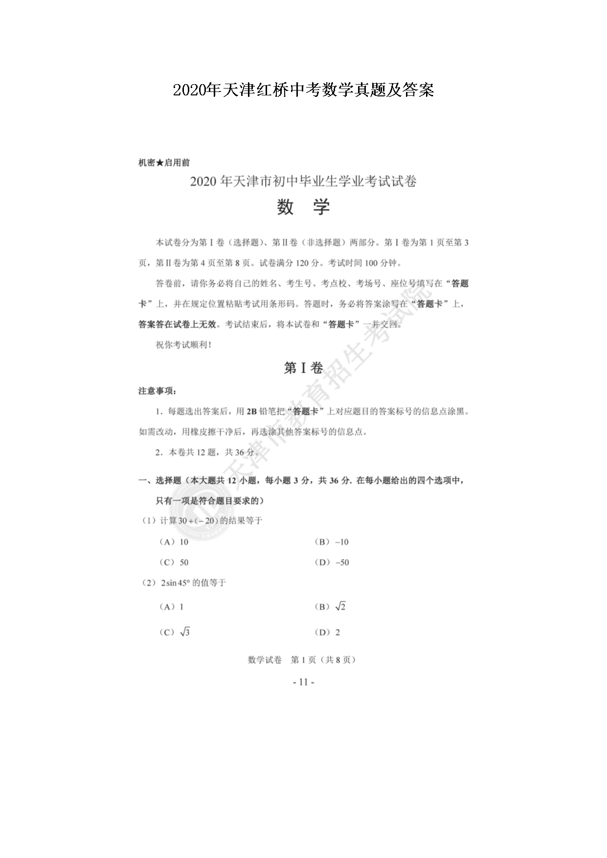 【文档名称】 2020年天津红桥中考数学真题及答案(图片版).doc