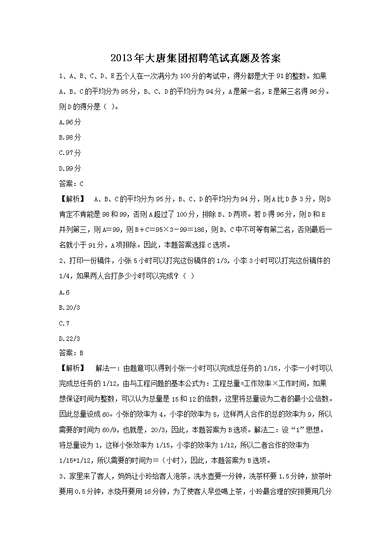 【文档名称】 2013年大唐集团招聘笔试真题及答案(Word版).doc