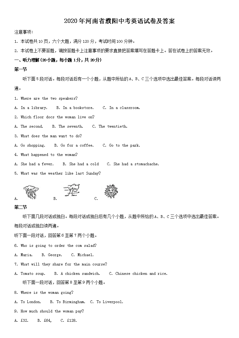 【文档预览】 无忧考网整理发布2020年河南省濮阳中考英语试卷及答案(Word版),前五页预览如下: