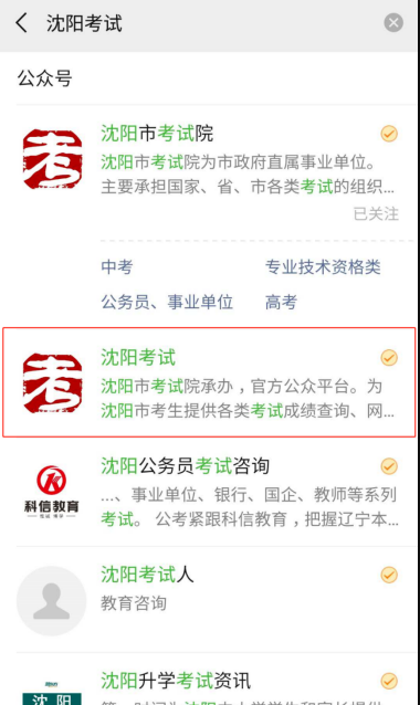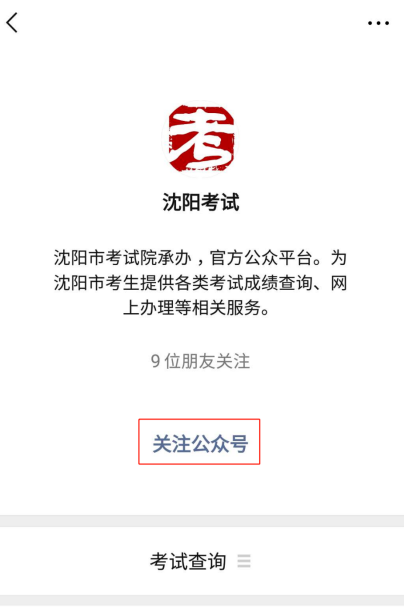 1.关注微信公众号。考生在2020年7月22日10:00至7月25日17:00期间,可通过手机微信查询并关注“沈阳考试”微信公众号。