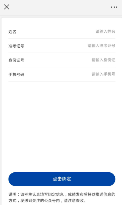 2.订阅服务。考生通过考试查询菜单中的个人中心,填写考生姓名、准考证号、身份证号、手机号码四项信息后【点击绑定】按钮,即可绑定考生信息,完成订阅。
