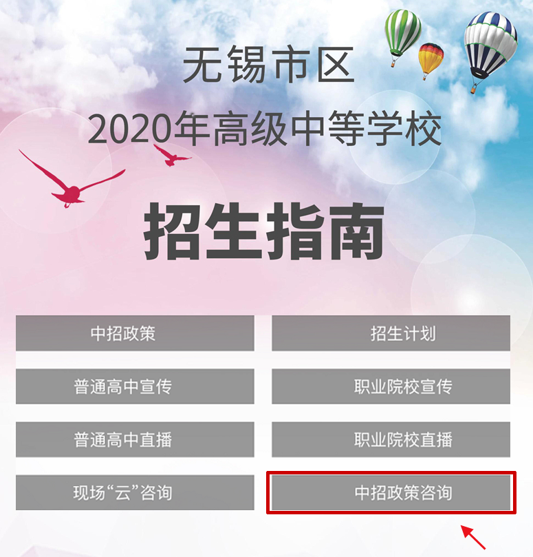参与方式:长按识别下方二维码,关注无锡教育微信,点击底部菜单栏:招生考试——中招指南,进入“招生指南”页面后,点击进入“中招政策咨询”。