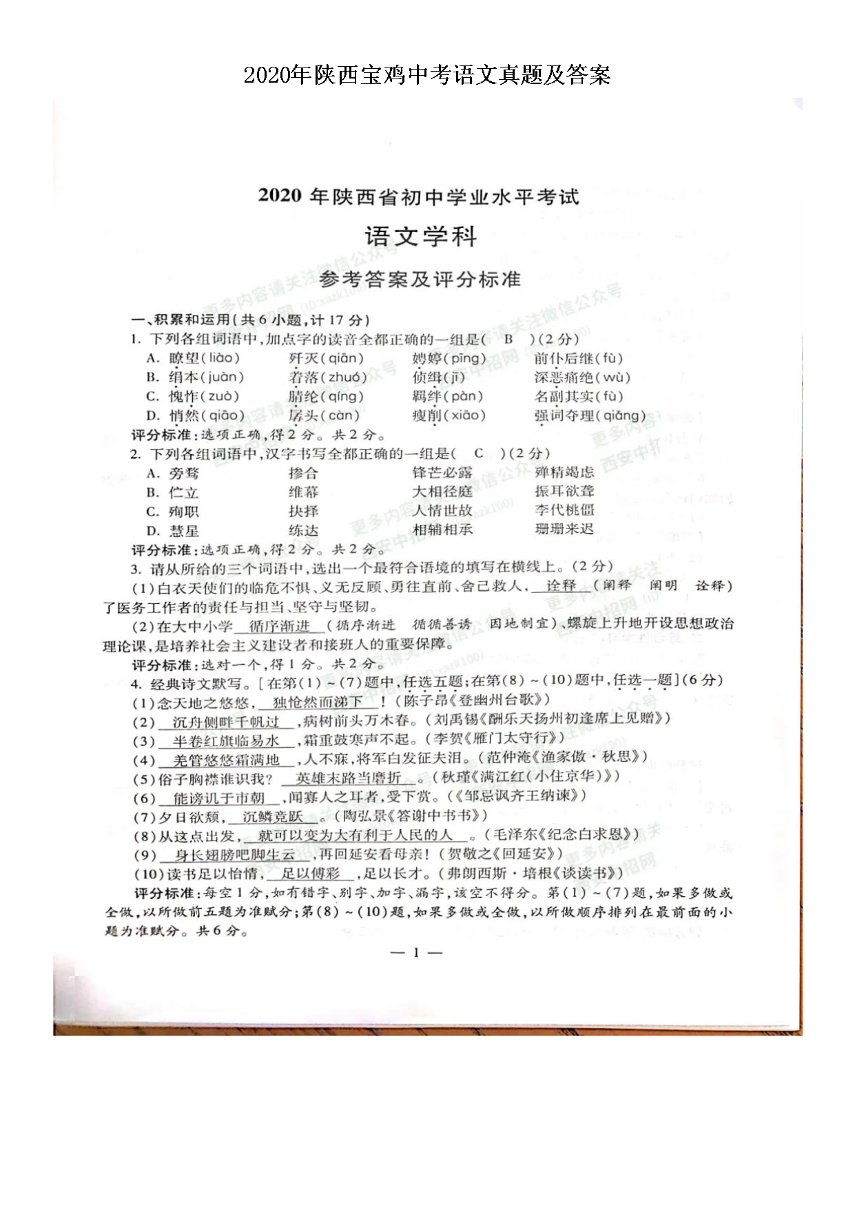 【文档预览】 无忧考网整理发布2020年陕西宝鸡中考语文真题及答案(图片版),前五页预览如下: