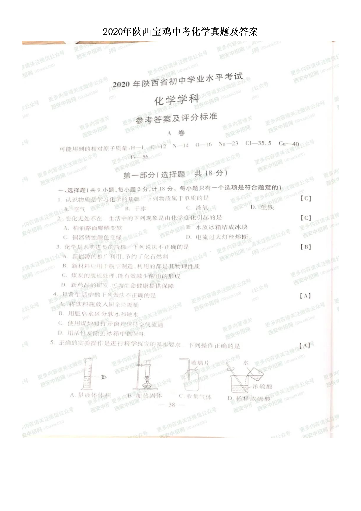 【文档预览】 无忧考网整理发布2020年陕西宝鸡中考化学真题及答案(图片版),前五页预览如下:
