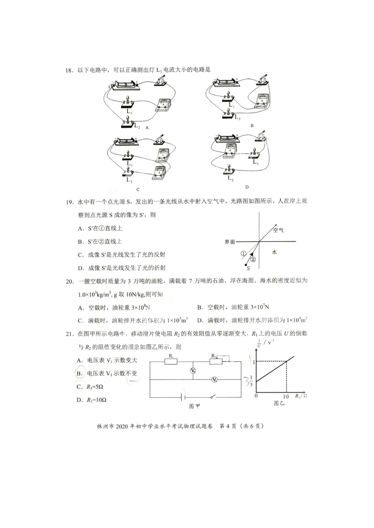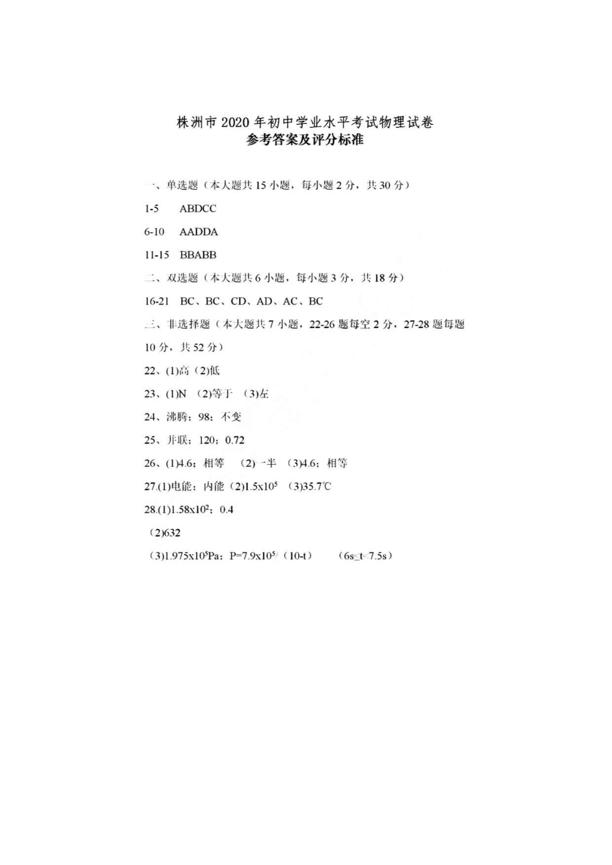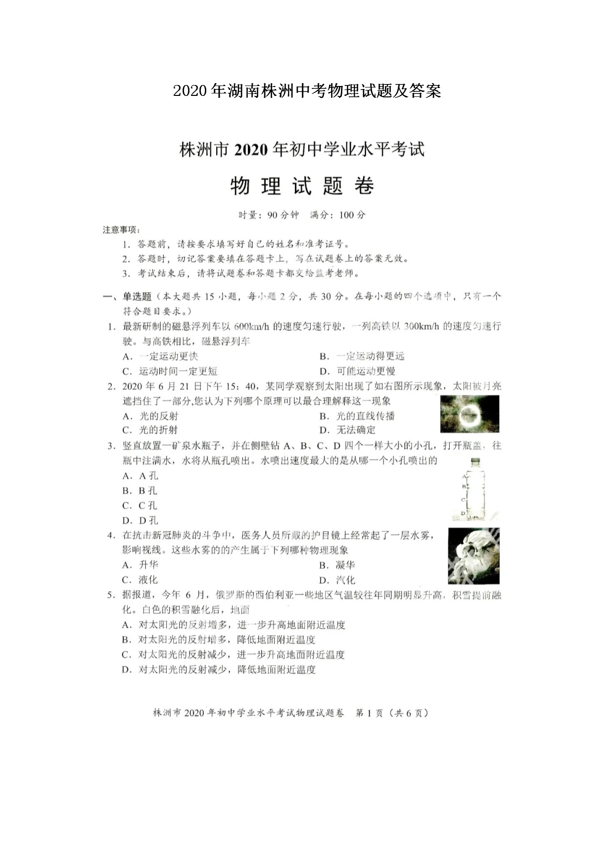 【文档名称】 2020年湖南株洲中考物理试题及答案(图片版).doc