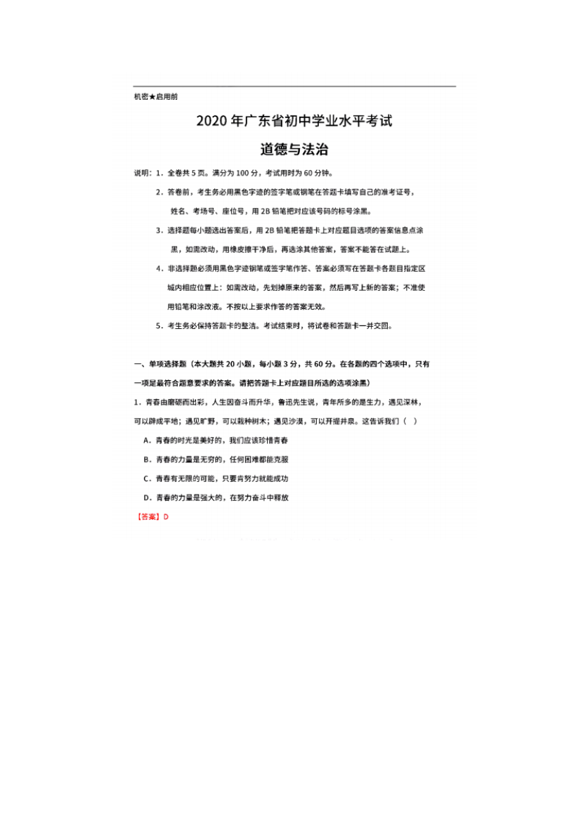 【文档名称】 2020广东茂名中考政治真题及答案(图片版).doc