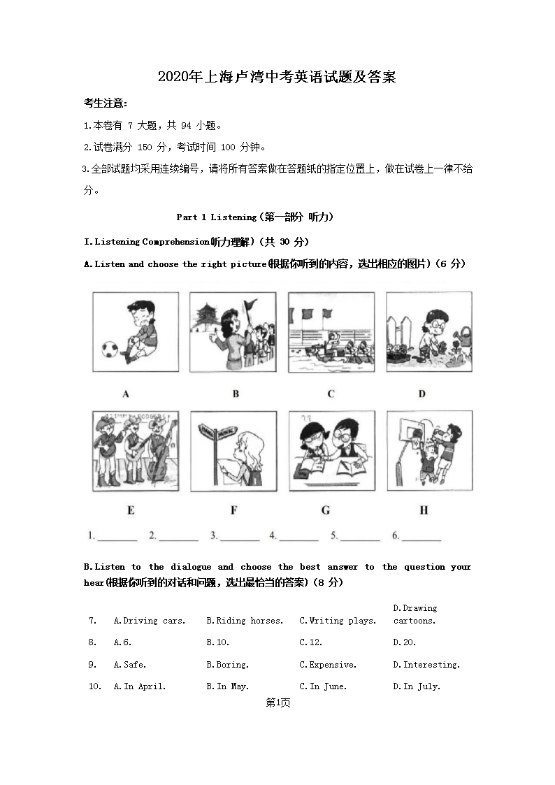 【文档名称】 2020年上海卢湾中考英语试题及答案(Word版).doc