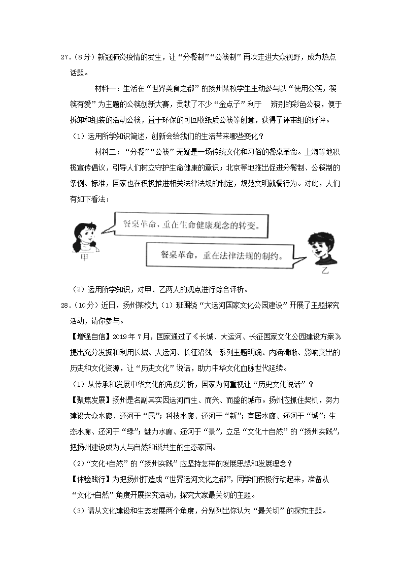 【文档名称】 2020年江苏扬州中考道德与法治真题及答案(Word版).doc