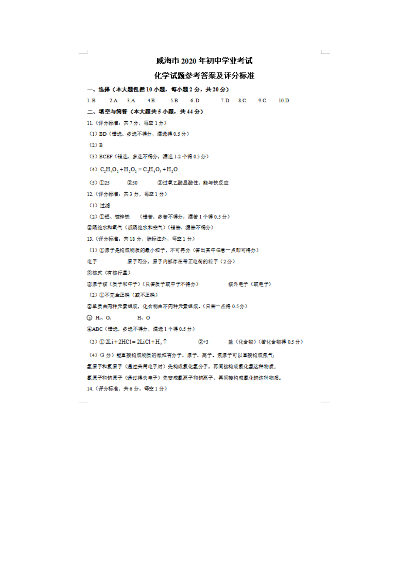 【文档名称】 2020年山东威海中考化学真题及答案(图片版).doc