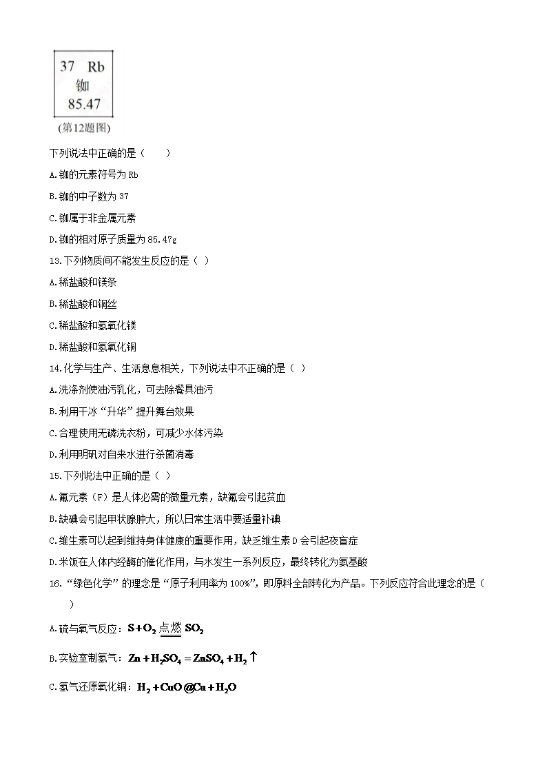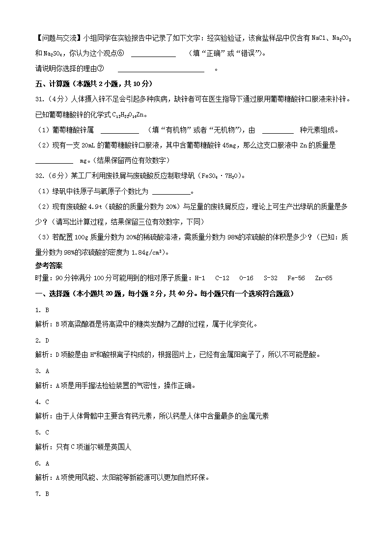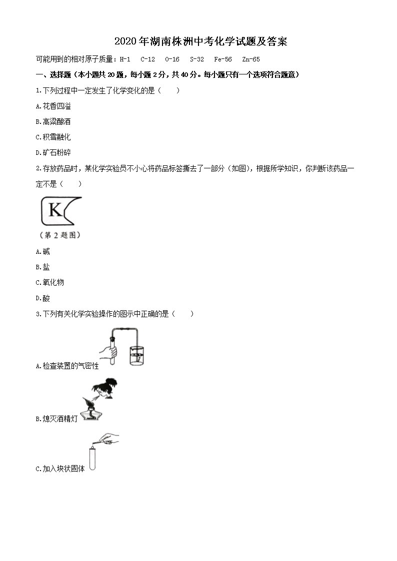 【文档名称】 2020年湖南株洲中考化学试题及答案(Word版).doc