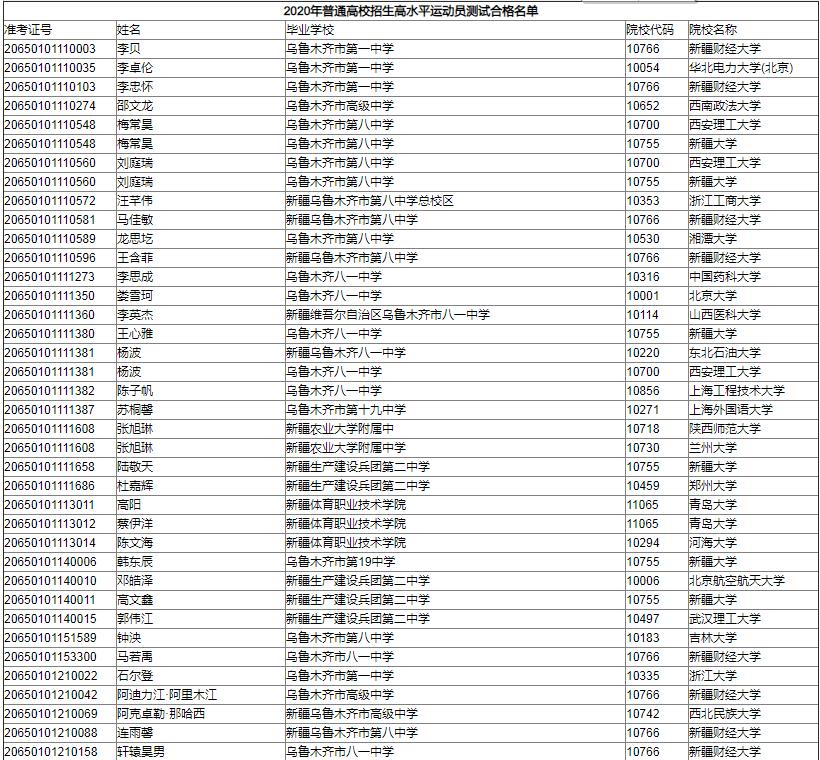 从新疆招生网了解到,2020年新疆普通高校招生高水平运动员测试合格名单已公示,为方便考生查阅,现将有关人员名单公布如下:
