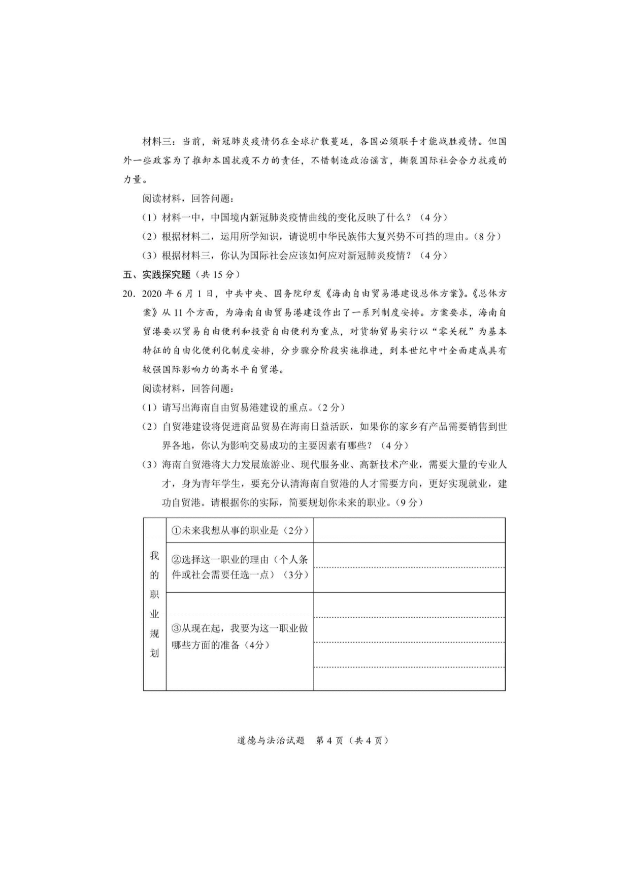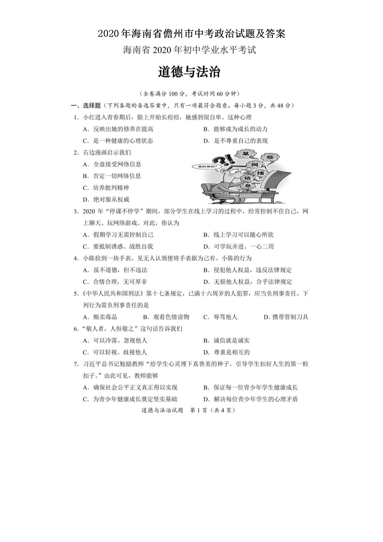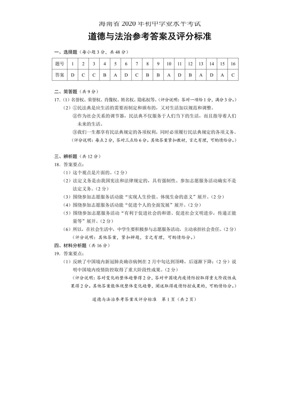 【文档名称】 2020年海南省儋州市中考政治试题及答案(图片版).doc