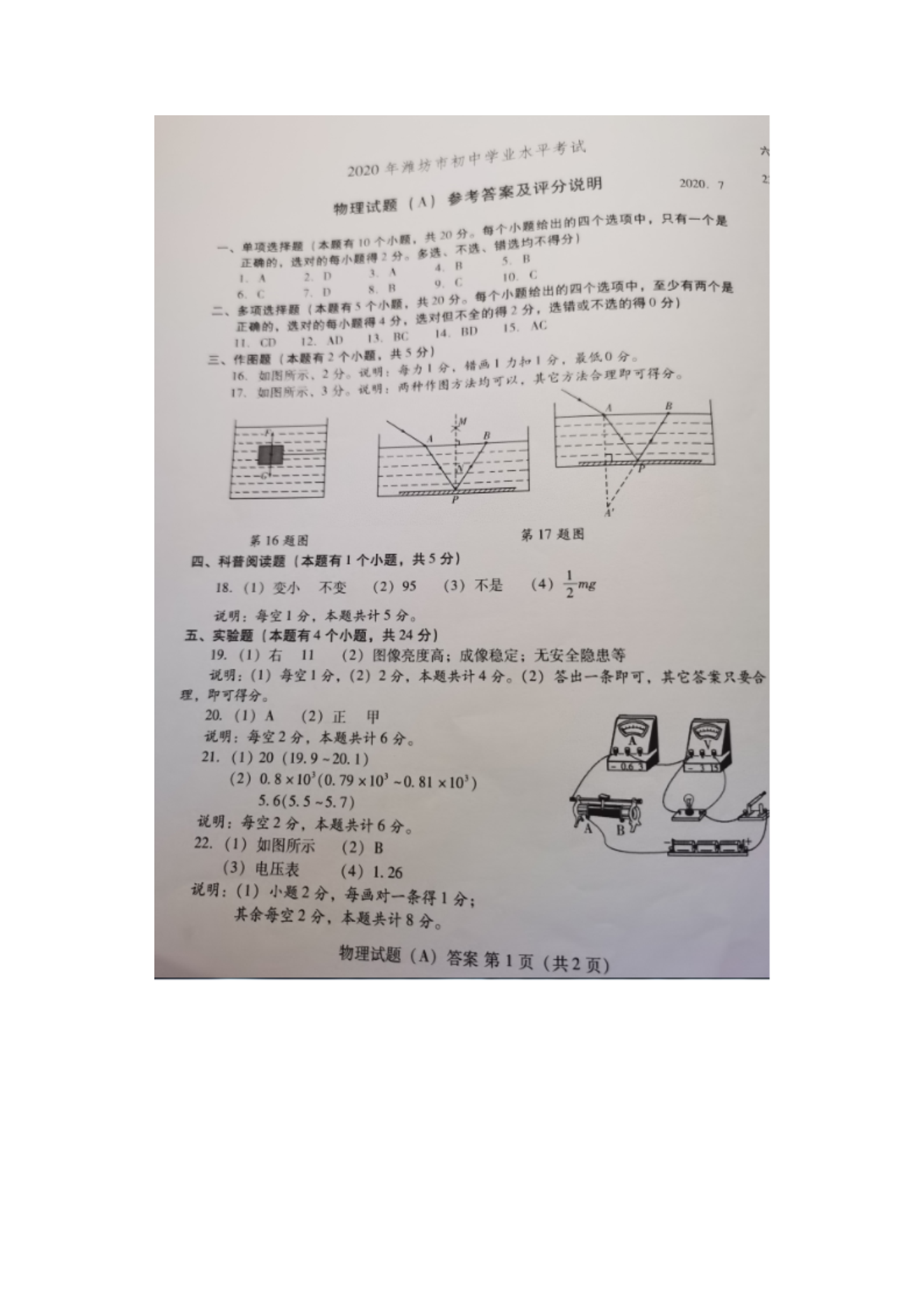 【文档名称】 2020年山东潍坊中考物理真题及答案(图片版).doc