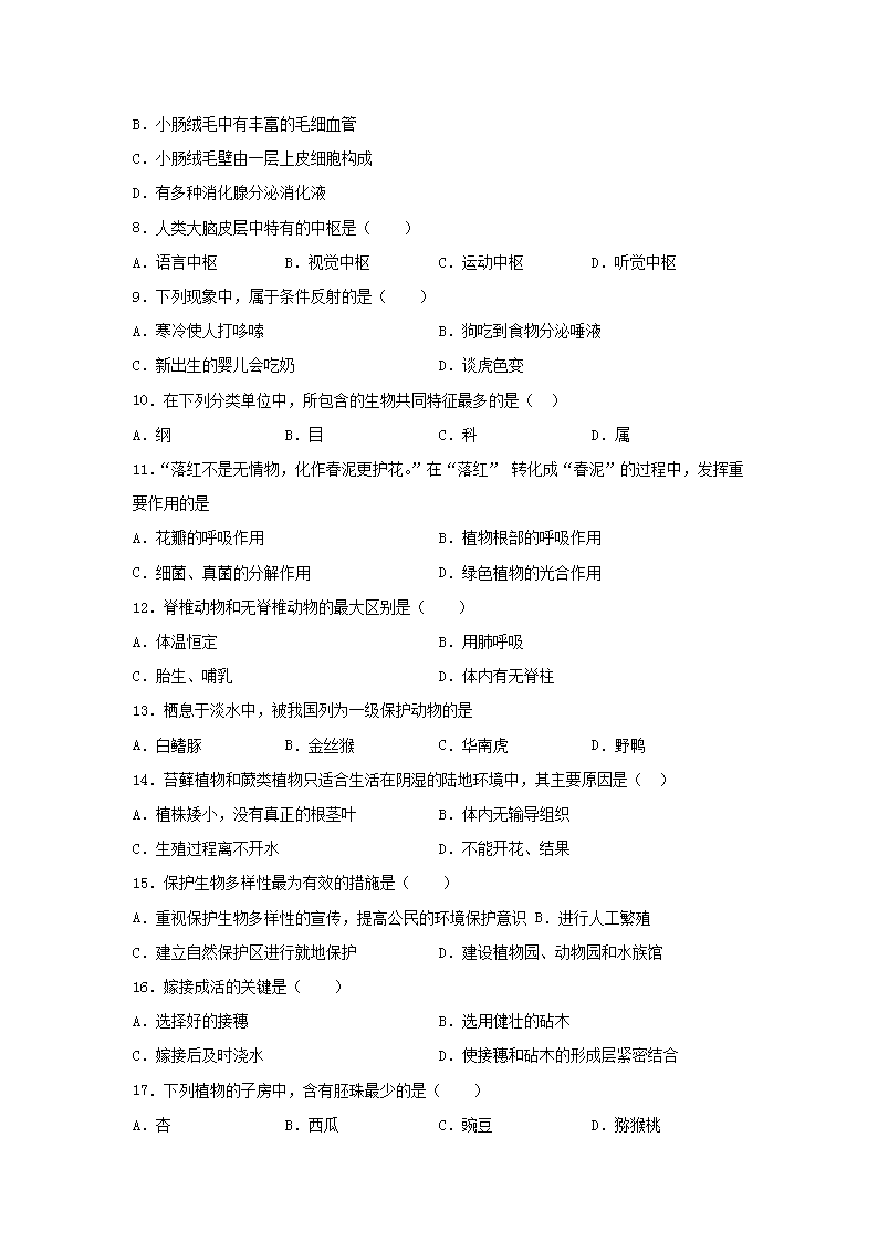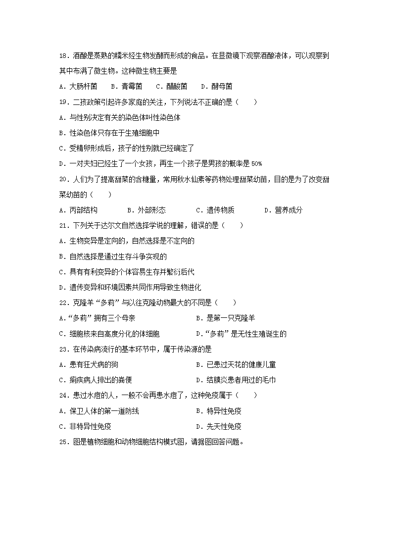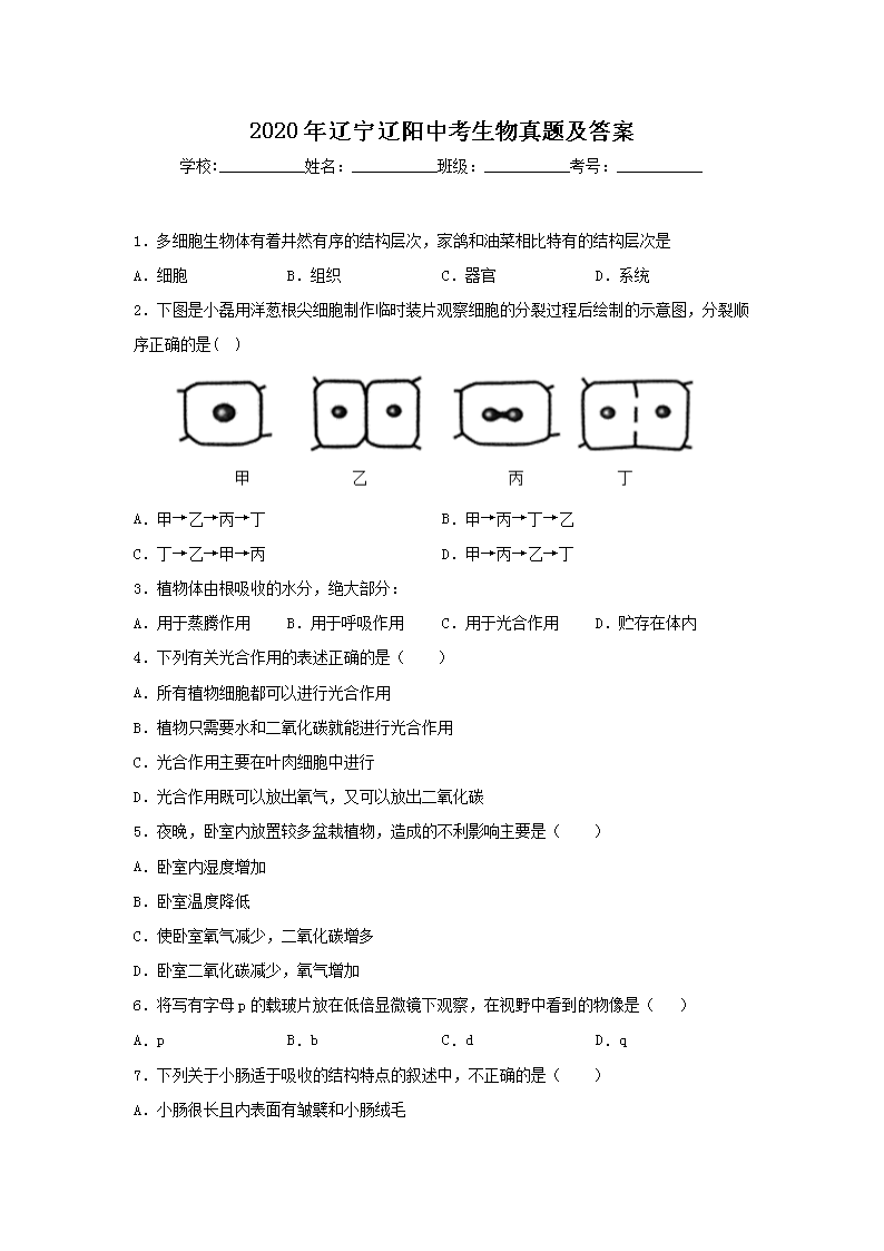 【文档预览】 无忧考网整理发布2020年辽宁辽阳中考生物真题及答案(Word版),前五页预览如下: