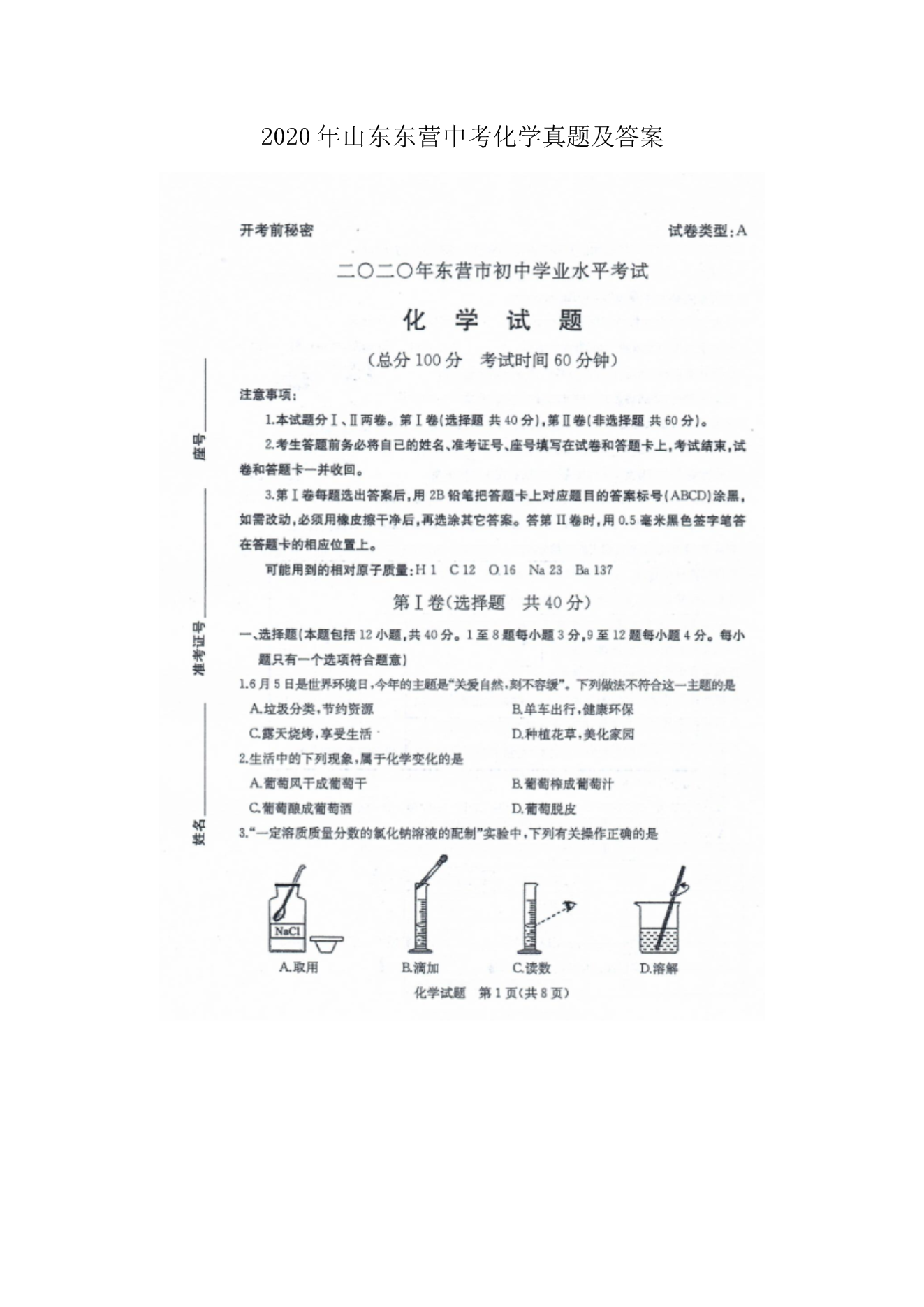 【文档名称】 2020年山东东营中考化学真题及答案(图片版).doc