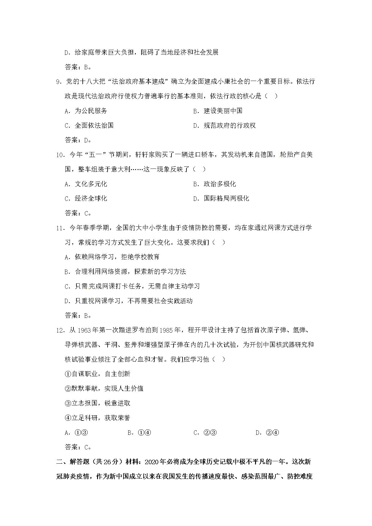 【文档名称】 2020年四川凉山中考政治真题及答案(Word版).doc