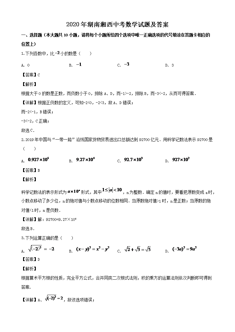 【文档名称】 2020年湖南湘西中考数学试题及答案(Word版).doc