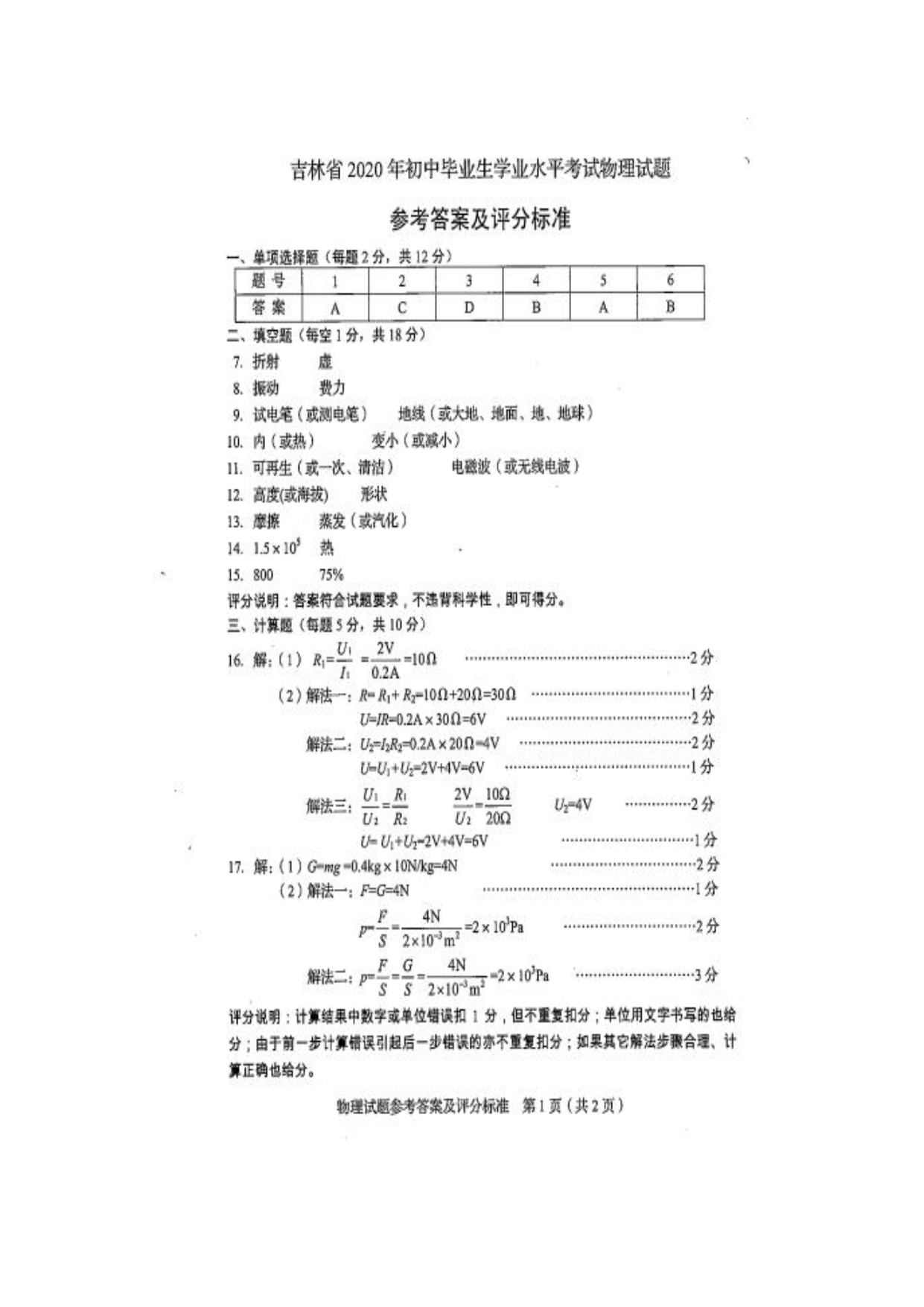 【文档名称】 2020年吉林松原中考物理真题及答案(图片版).doc