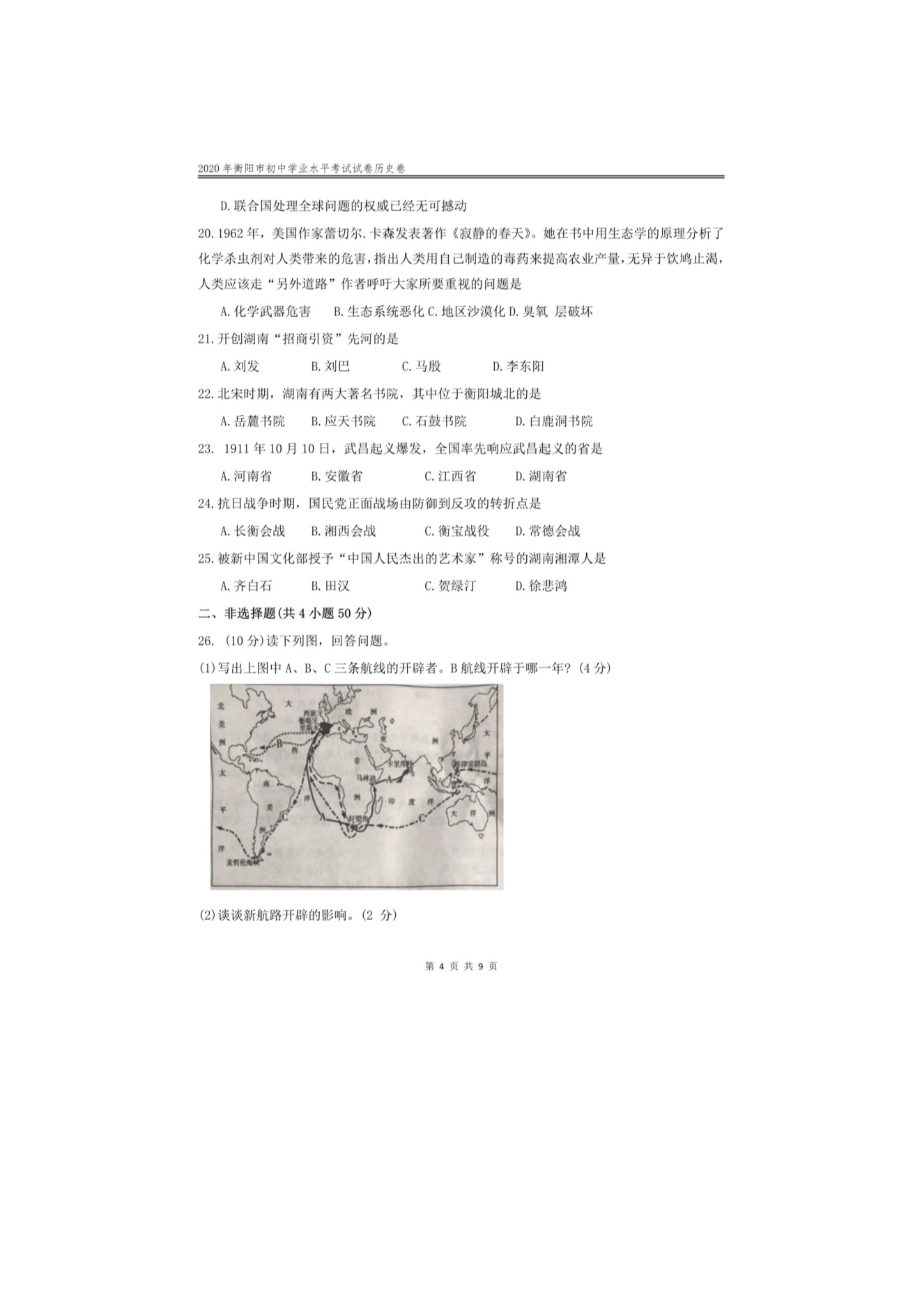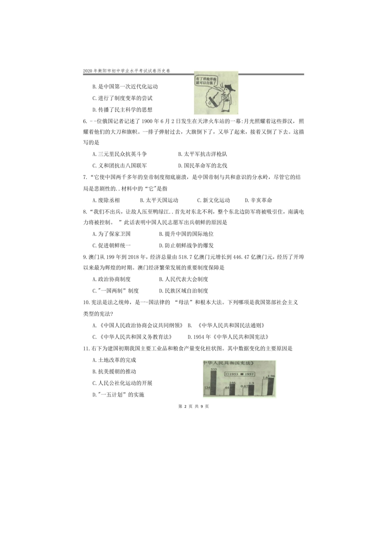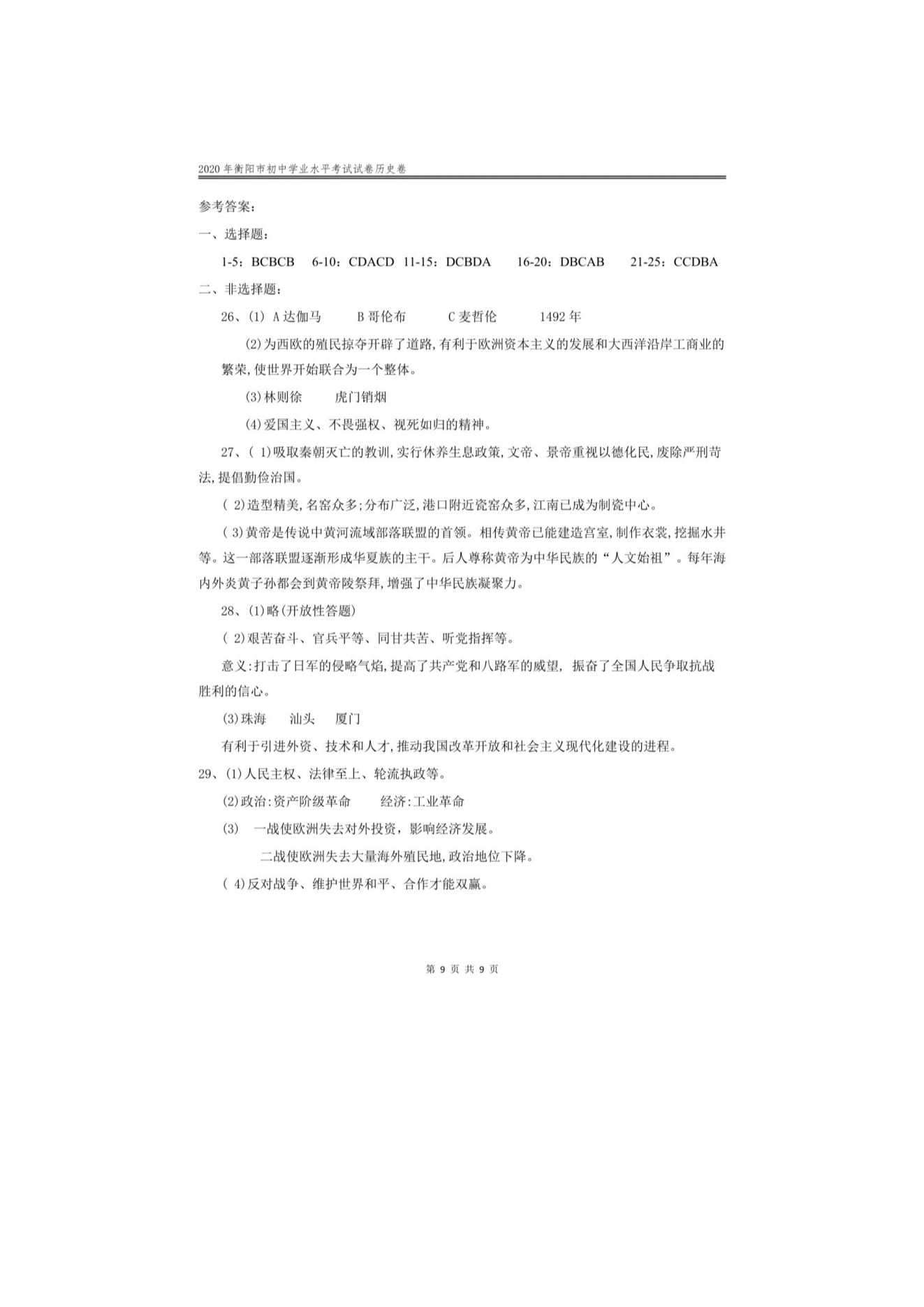 【文档名称】 2020年湖南衡阳中考历史试题及答案(图片版).doc