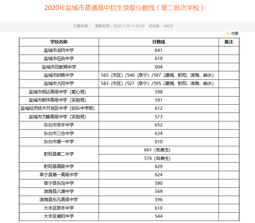 2020年江苏盐城中考录取分数线公布(各批次+各院校)