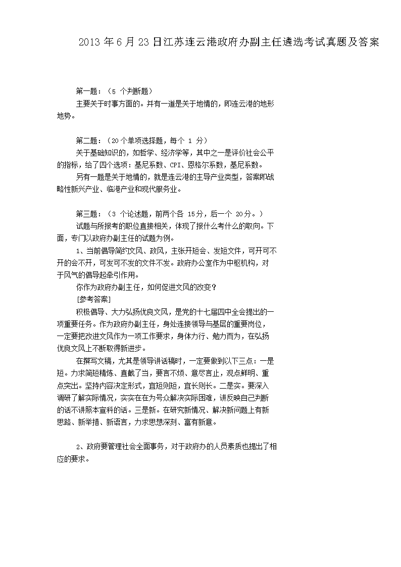 【文档名称】 2013年6月23日江苏连云港政府办副主任遴选考试真题及答案(Word版).doc
