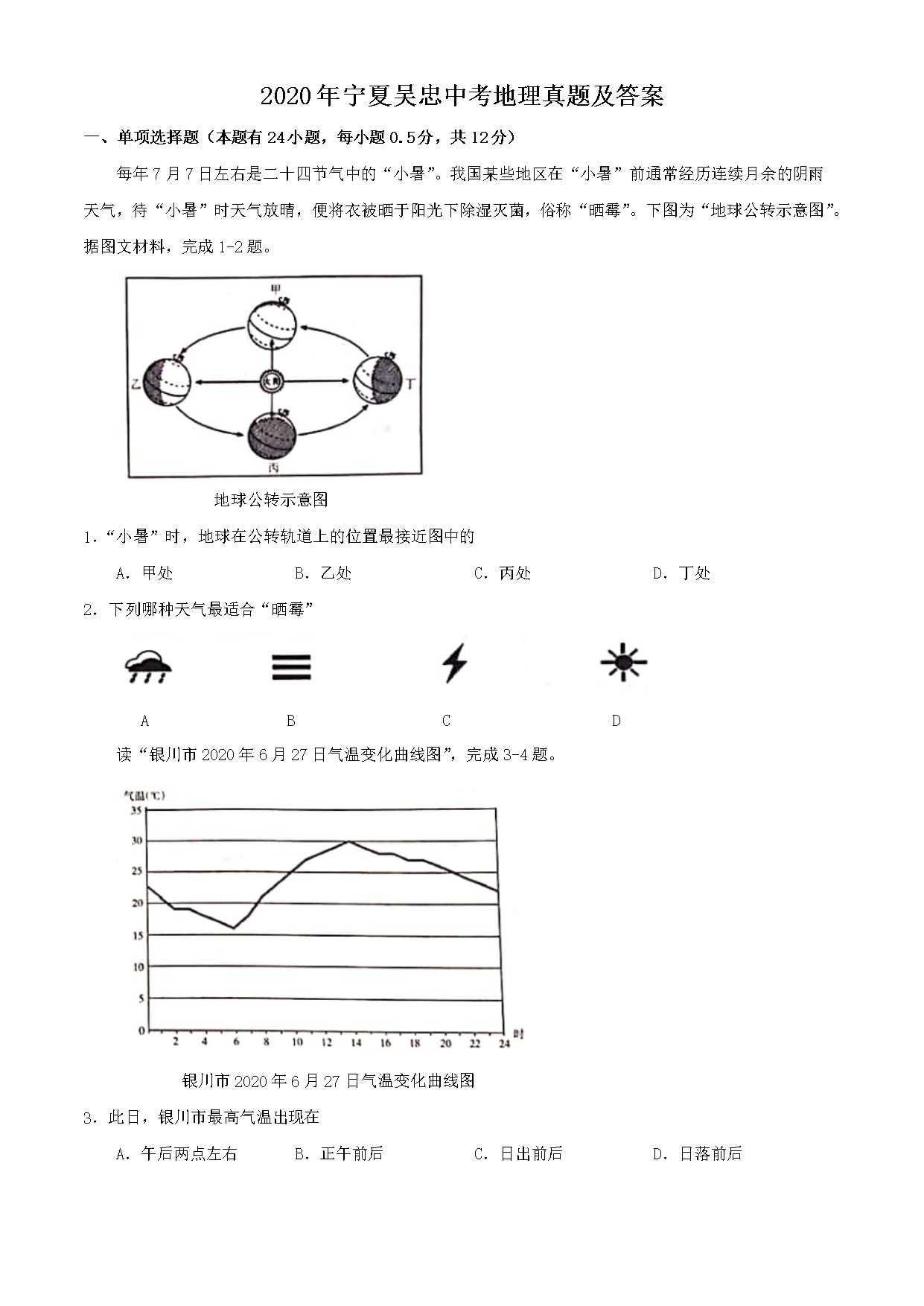 【文档预览】 无忧考网整理发布2020年宁夏吴忠中考地理真题及答案(Word版),前五页预览如下: