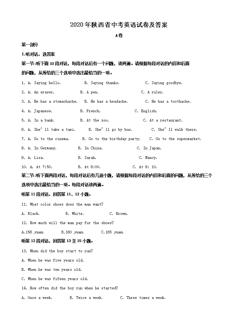 【文档名称】 2020年陕西省中考英语试卷及答案(Word版).doc