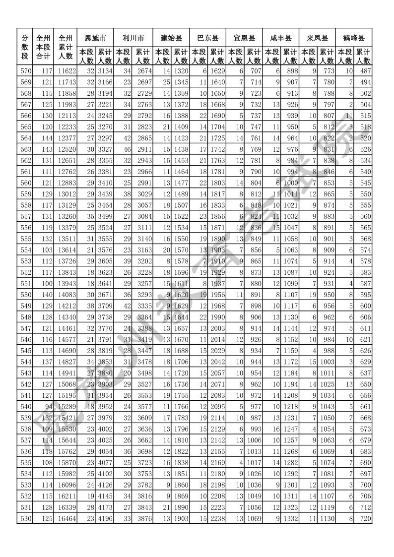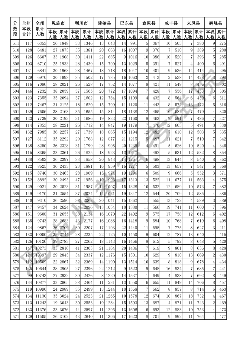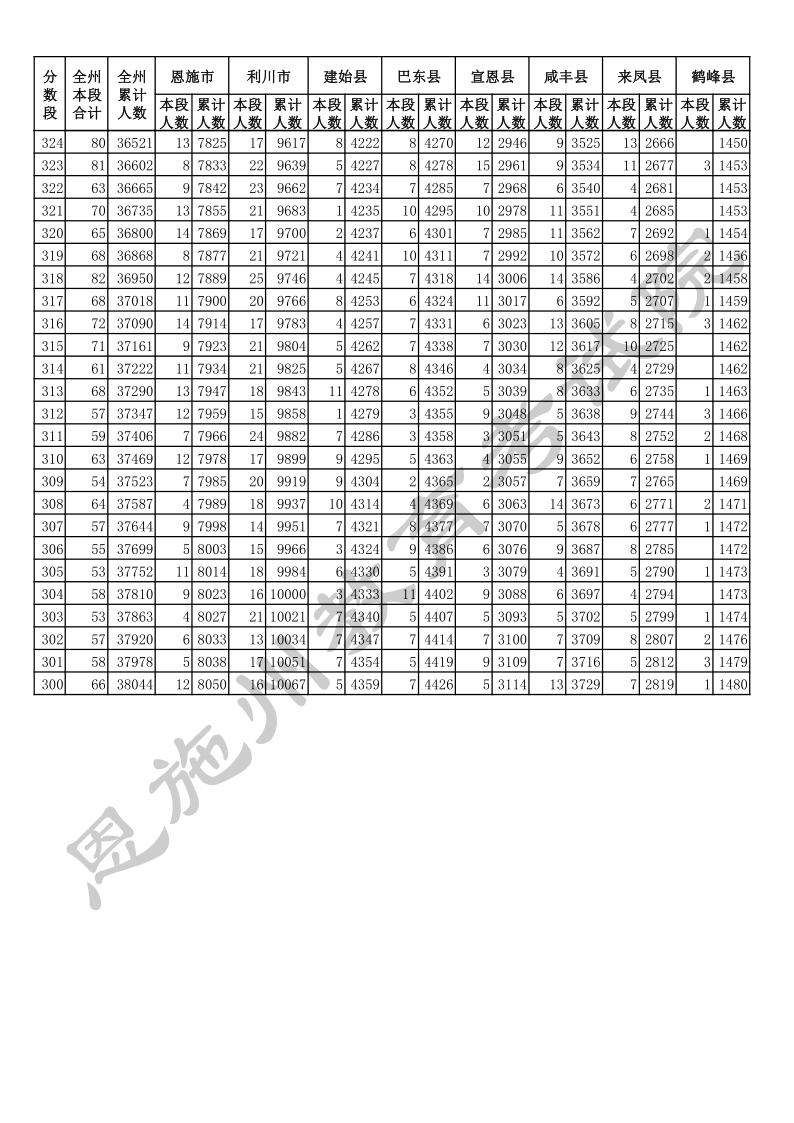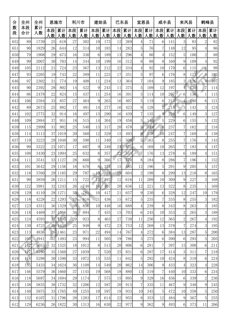 2020年湖北恩施中考总分一分一段统计表.docx