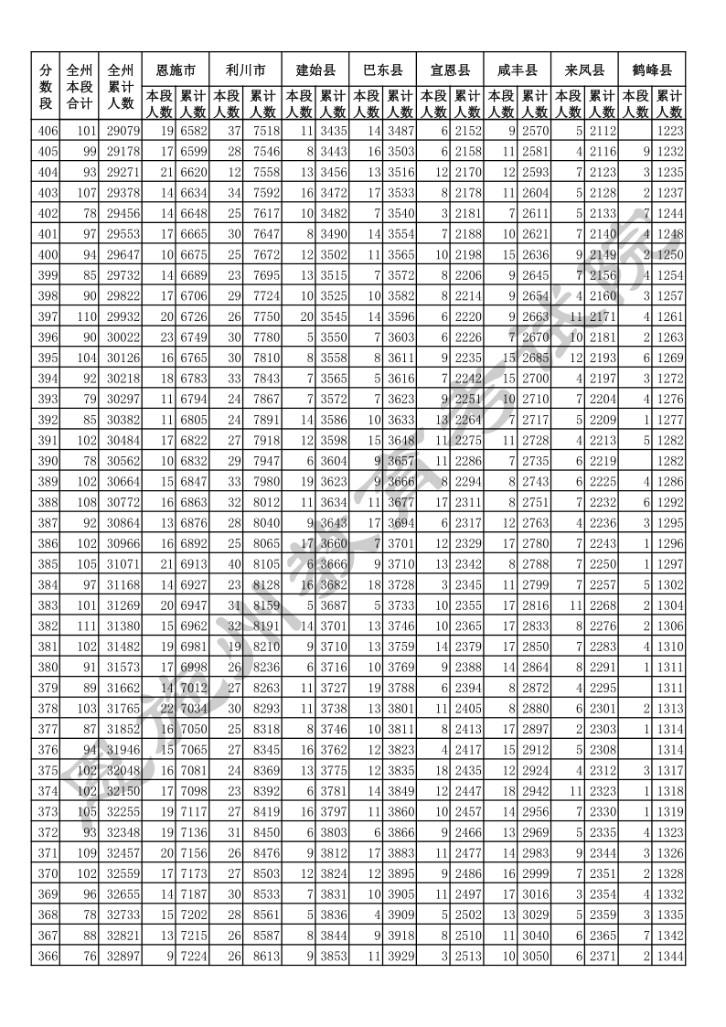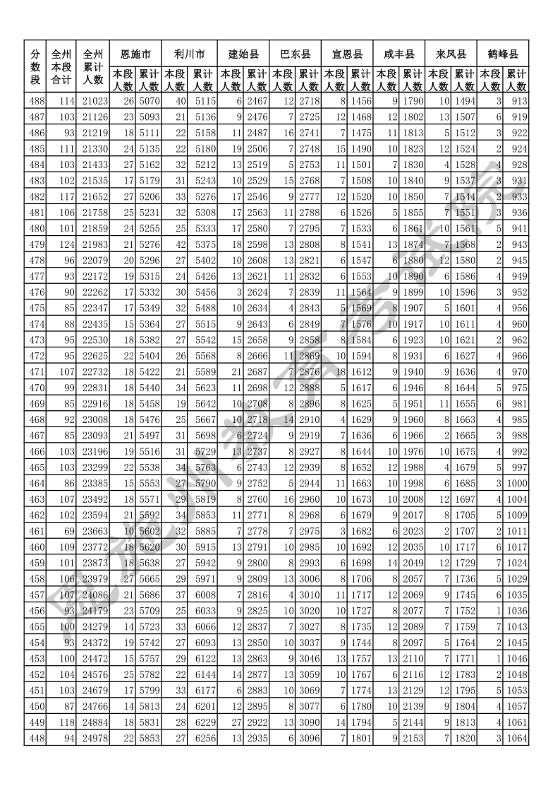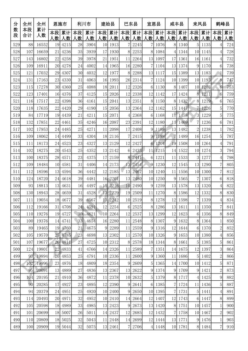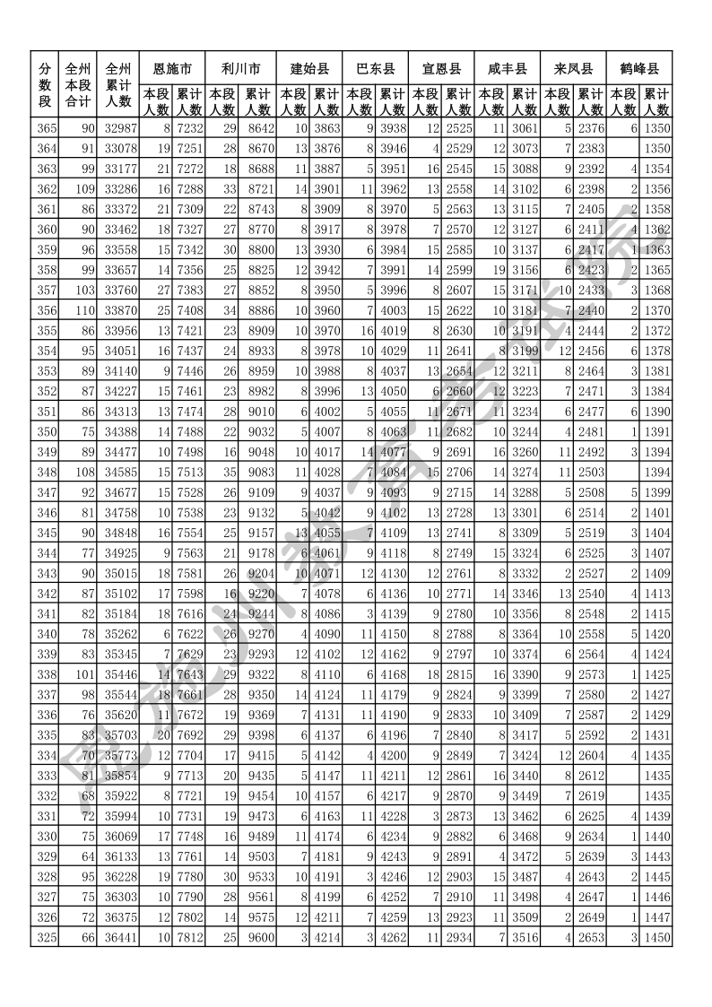 2020年湖北恩施中考总分一分一段统计表.docx