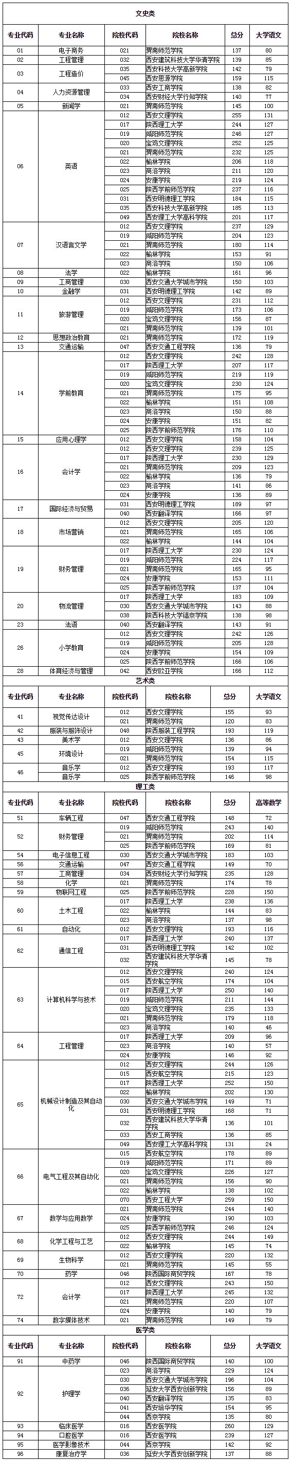 2020年陕西省普通高等教育专升本招生第一阶段录取已经完成,现将各专业分校录取分公布如下。总分相同,按大学语文(高等数学)、大学英语排位录取。