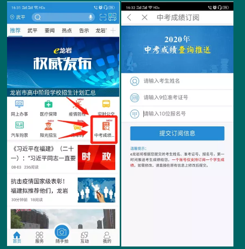 【#中考# #2020年福建龙岩中考成绩查询入口已开通(附查分方式)#】2020年福建龙岩中考成绩查询入口已开通,2020年福建龙岩市中考成绩“e龙岩”一键订阅开始啦!赶紧来看看如何操作吧!