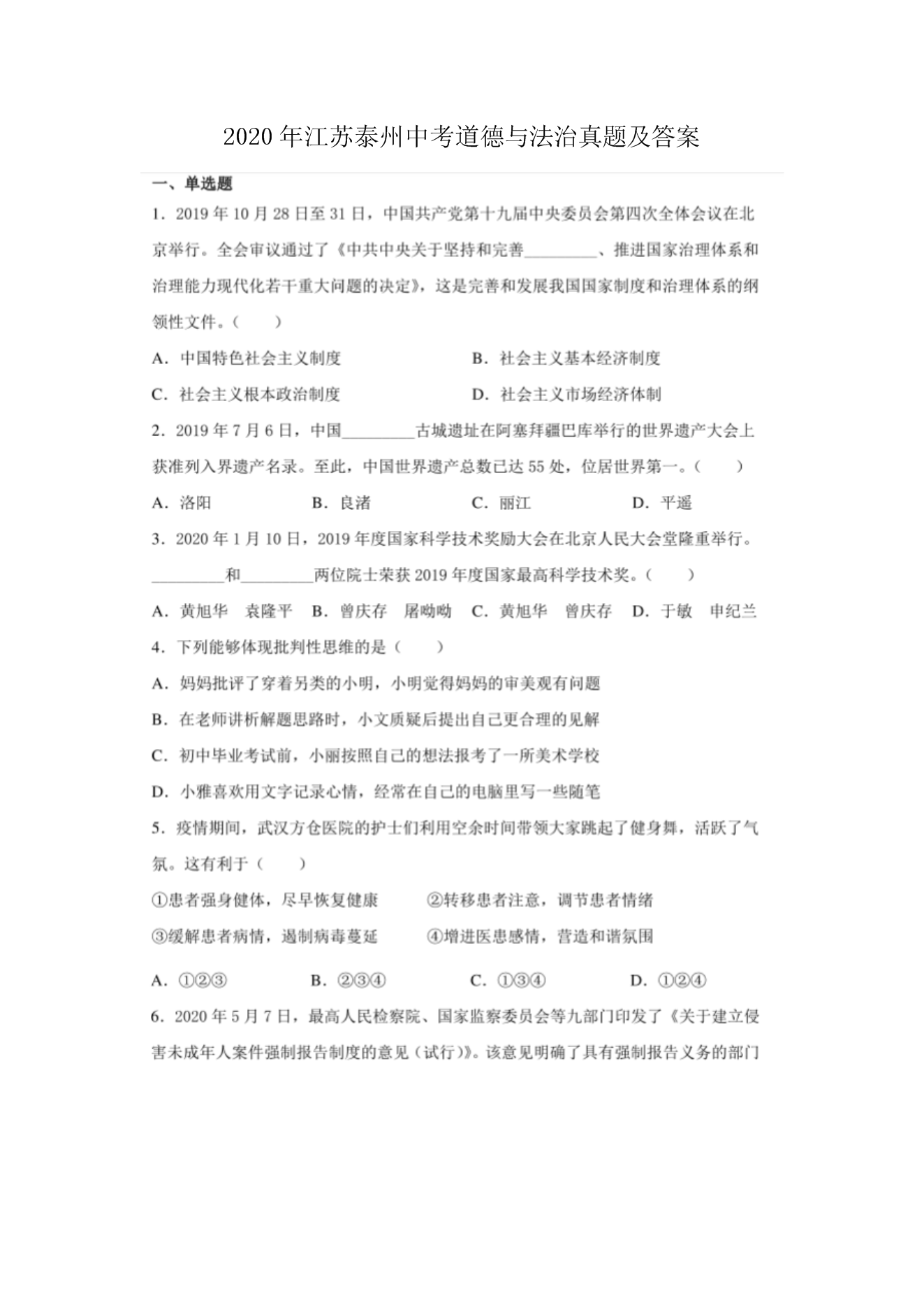 【文档名称】 2020年江苏泰州中考道德与法治真题及答案(图片版).doc