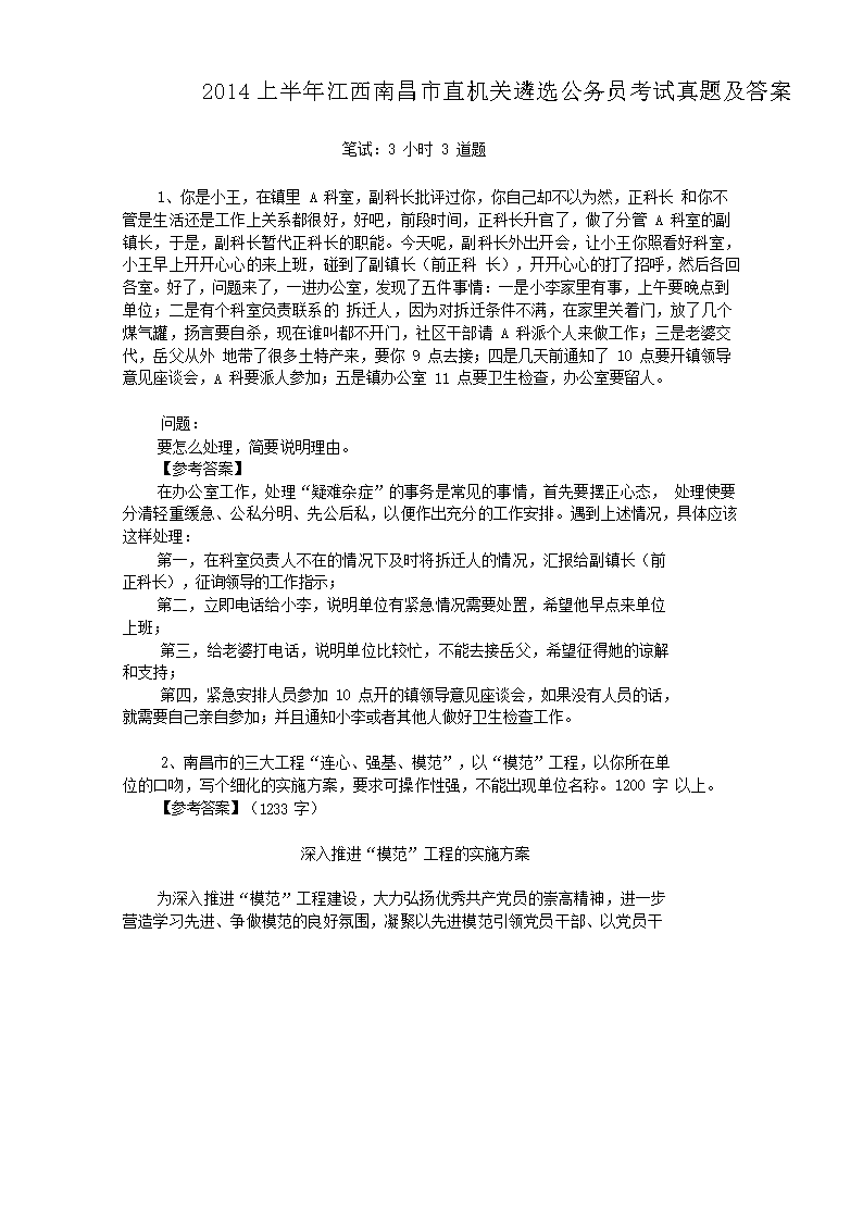 【文档名称】 2014上半年江西南昌市直机关遴选公务员考试真题及答案(Word版).doc