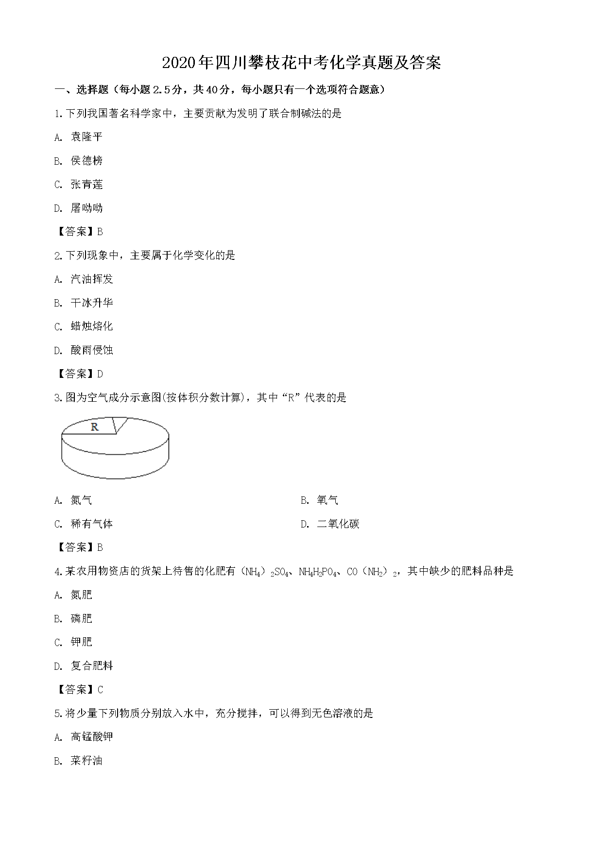 【文档预览】 无忧考网整理发布2020年四川攀枝花中考化学真题及答案(Word版),前五页预览如下: