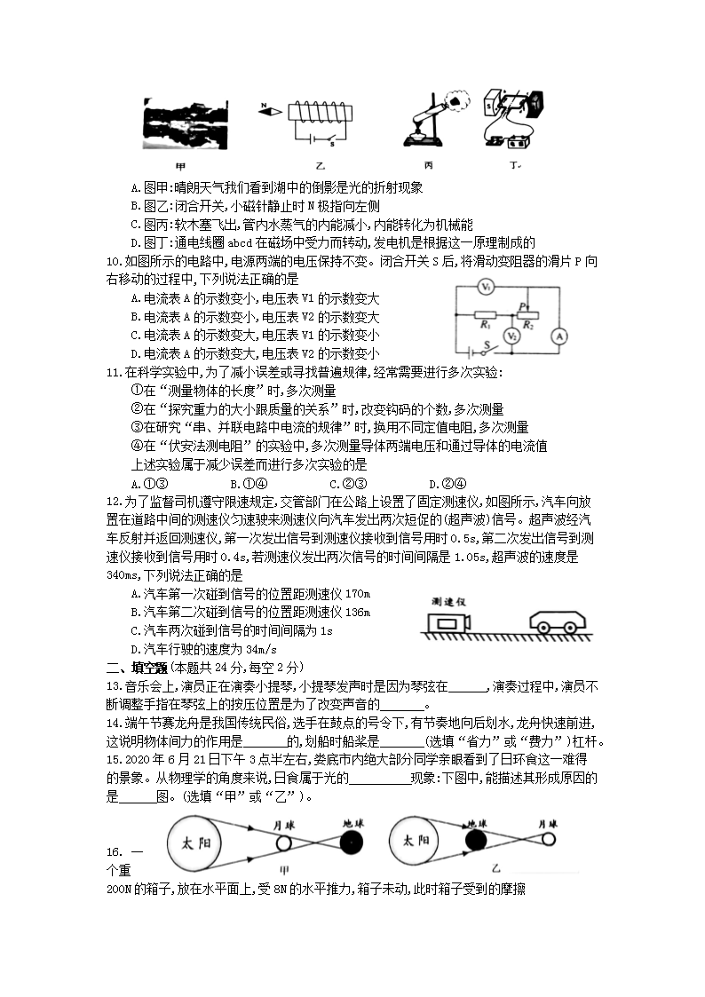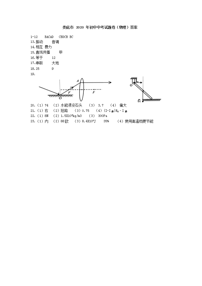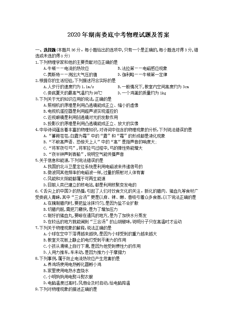 【文档名称】 2020年湖南娄底中考物理试题及答案(Word版).doc