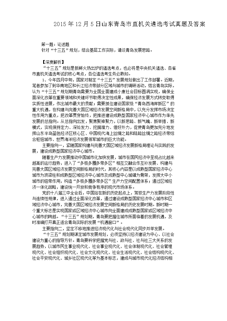 【文档名称】 2015年12月5日山东青岛市直机关遴选考试真题及答案(Word版).doc