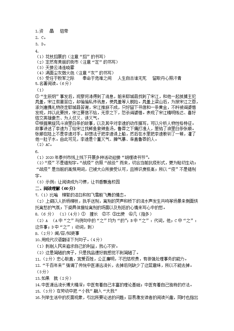 【文档名称】 2020年江苏泰州中考语文真题及答案(Word版).doc