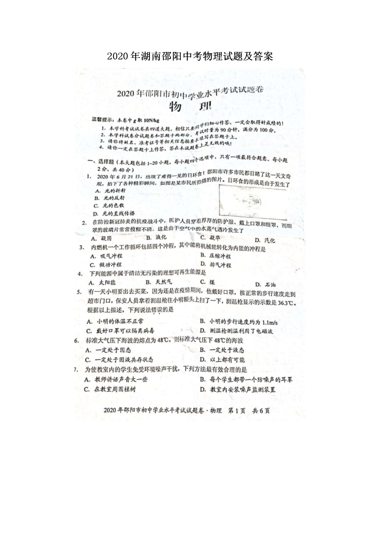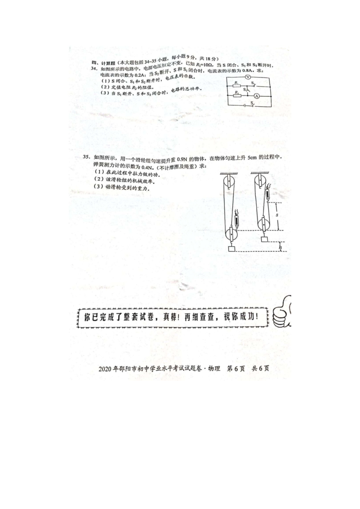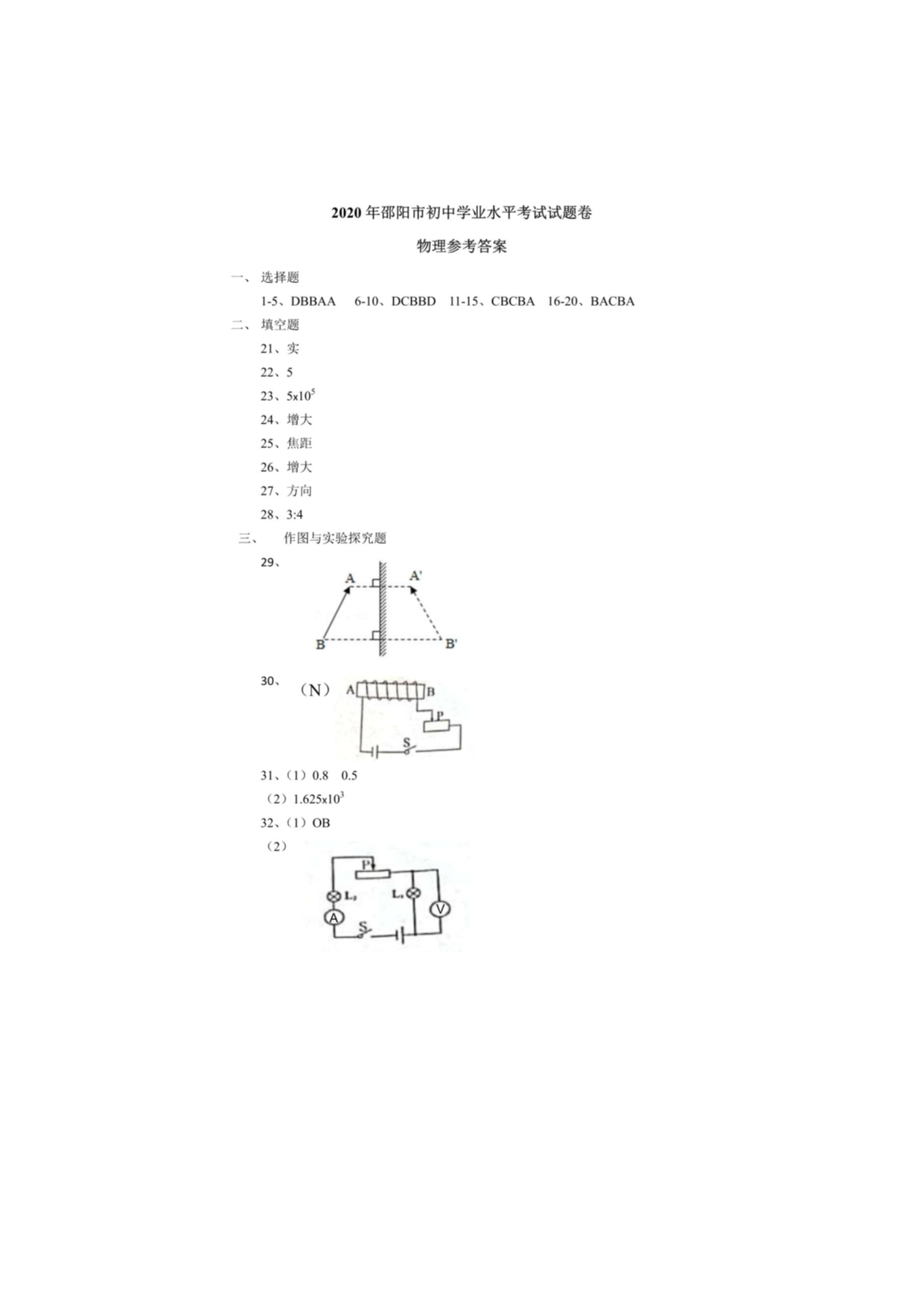 【文档名称】 2020年湖南邵阳中考物理试题及答案(图片版).doc