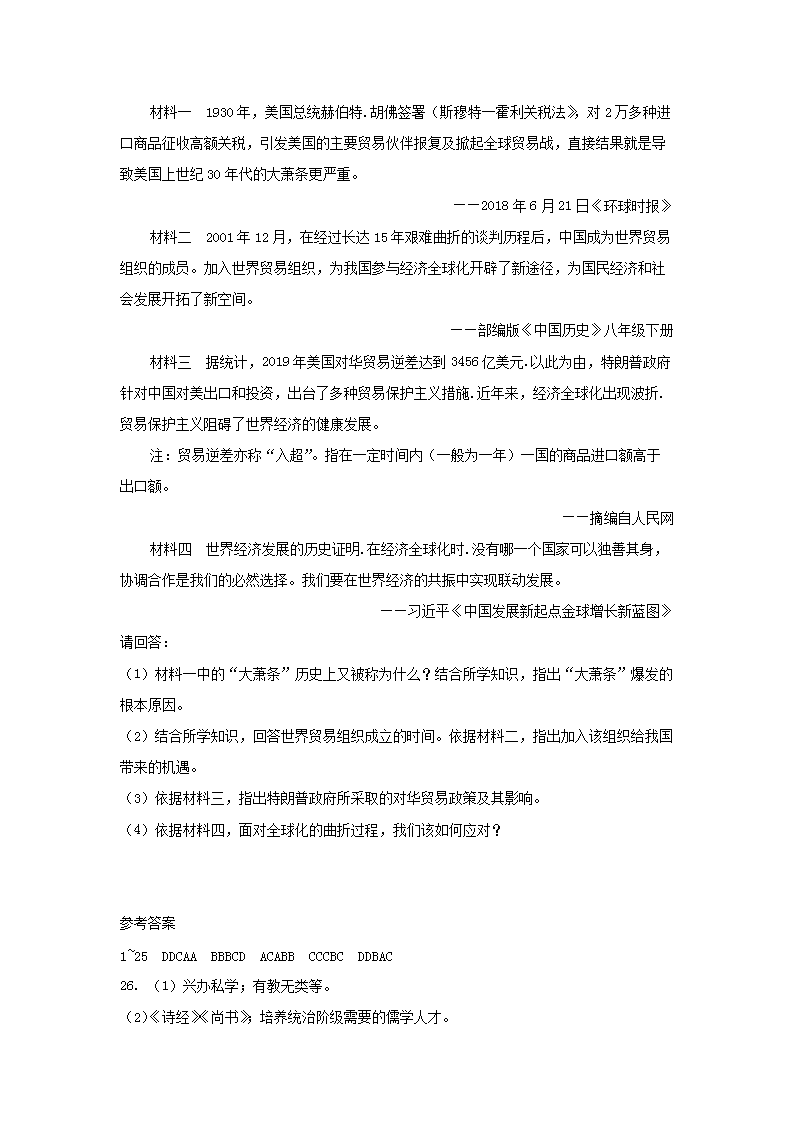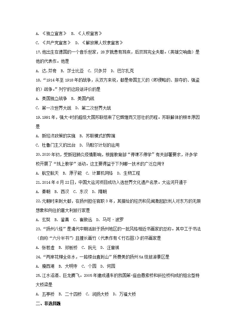 【文档名称】 2020年江苏扬州中考历史真题及答案(Word版).doc