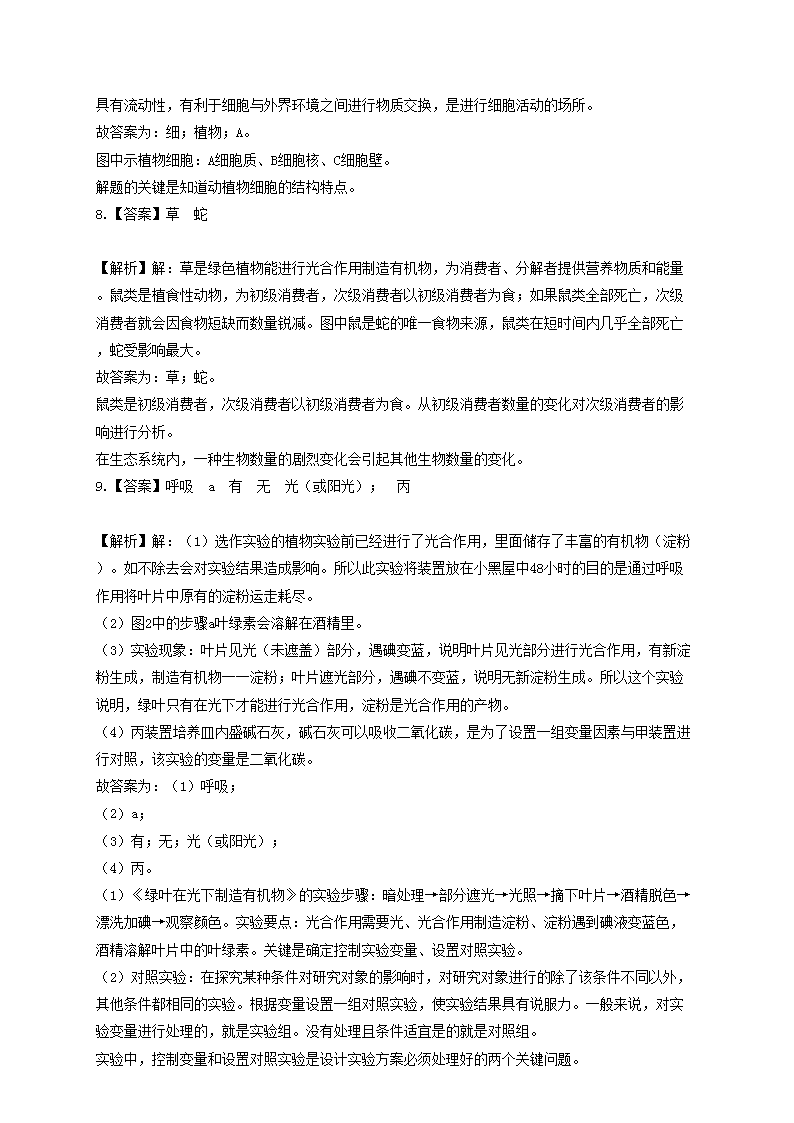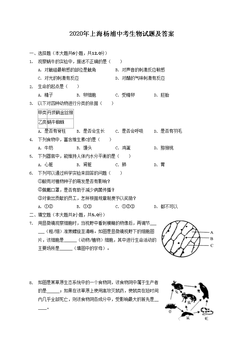 【文档名称】 2020年上海杨浦中考生物试题及答案(Word版).doc